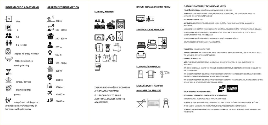 Kurtaxe ist im Preis inbegriffen.Nicht erstattungsfähige Anzahlung: Die Anzahlung von 30% dient als Buchungsgarantie und Entschädigung im Falle des Nichterscheinens; sie ist nicht erstattungsfähig. Vorzeitige Abreise (Wunsch des Gastes): Wenn ein Gast seinen Aufenthalt freiwillig verkürzt, ist der volle Reservierungsbetrag zu zahlen. Schäden: Die Kaution von 150 € dient zur Deckung eventueller Schäden. Übersteigt der Schaden die Kaution, muss der Gast die Differenz sofort begleichen. Verstoß gegen die Hausordnung: Bei Verstößen gegen die Regeln hat der Eigentümer das Recht, die Reservierung zu stornieren. In diesem Fall wird der Betrag für die verbleibenden Tage (ab dem folgenden Tag) dem Gast zurückerstattet.