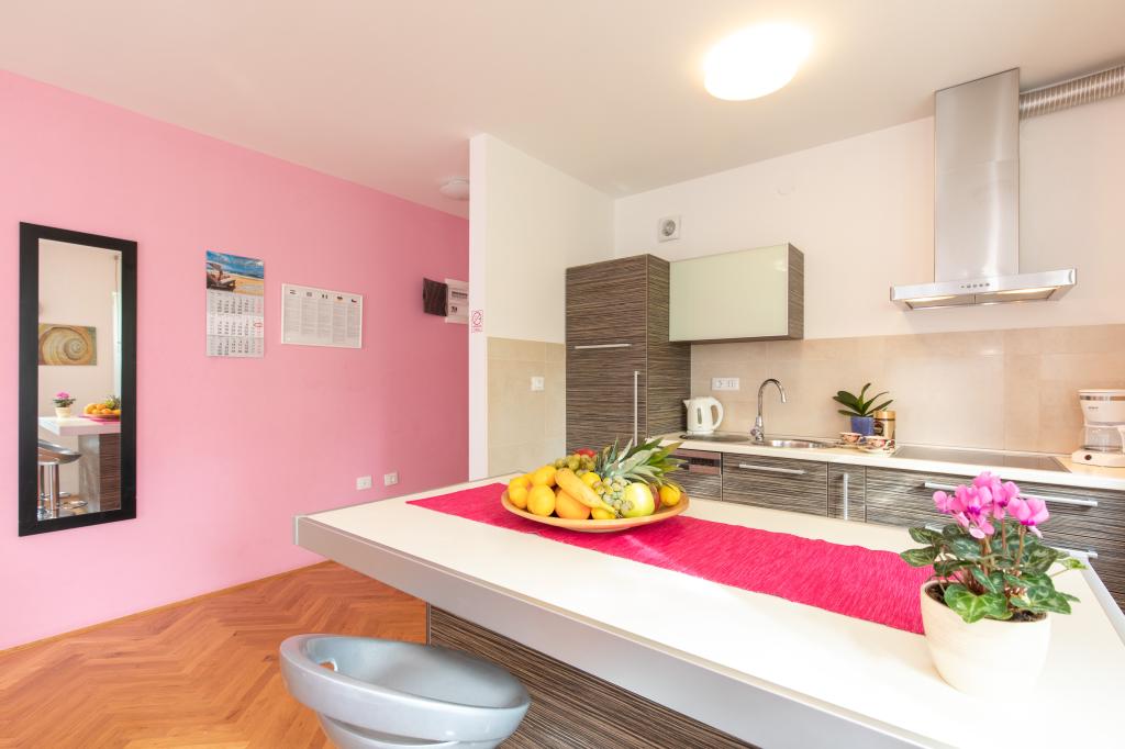 Die Apartments VillaMare befinden sich in einem ruhigen Teil von Baška, 5-7 Gehminuten von einem wunderschönen Sandstrand sowie dem Zentrum selbst mit allen Annehmlichkeiten einer Touristenstadt entfernt. Es gibt 5 Apartments in der 4****-Kategorie: 4 x A/4+2 für max. 4-6 Personen, 1 x A/2+2 für max. 2-4 Personen und ein schönes Studio für max. 1-2 Personen . Alle Wohnungen sind klimatisiert und modern ausgestattet, kostenloses WLAN, Sat-TV, 1 Parkplatz pro Wohnung; Im Hofteil steht allen Gästen ein Gartenbereich mit Grill, Holzpavillon und Kinderspielplatz zur Verfügung. Ein Kinderbett, ein Hochstuhl/Futtertisch und eine Waschmaschine sind auf Anfrage erhältlich. Alle Wohnungen im Anbau verfügen über eine gemütliche Terrasse, auf der Sie sich vollkommen entspannen und die schöne Aussicht auf Baška und die umliegenden Berge genießen können, während die Wohnung im Erdgeschoss über eine zusätzliche erweiterte Terrasse mit Liegestühlen und direktem Zugang zum schönen Garten verfügt ( ...und Feigenbäume :- )