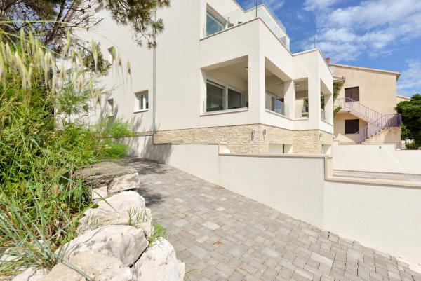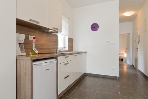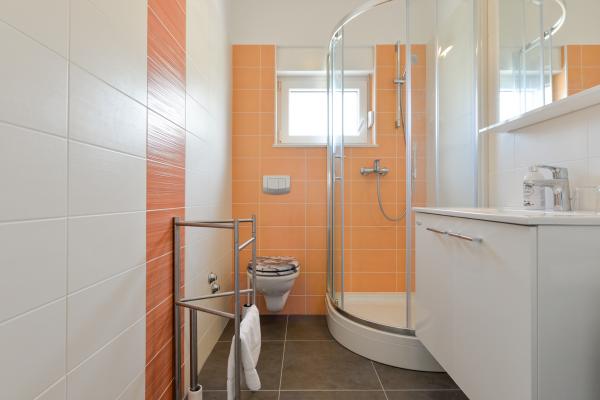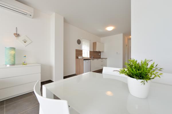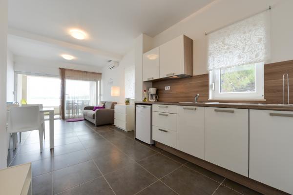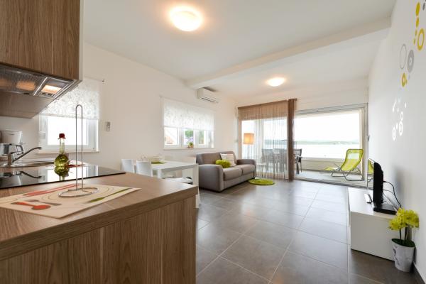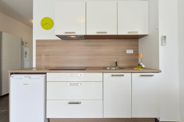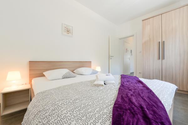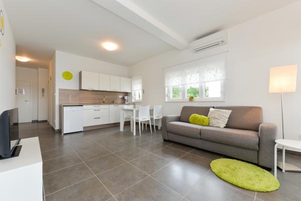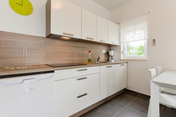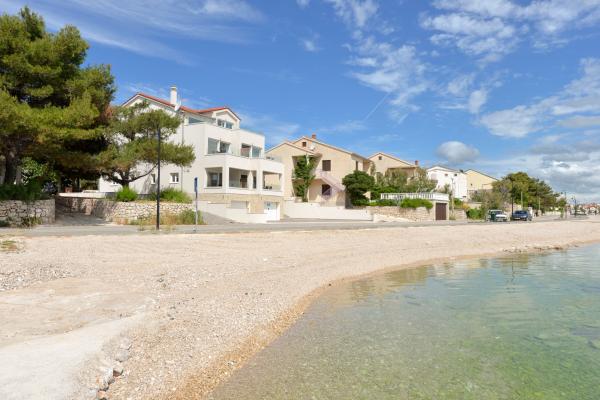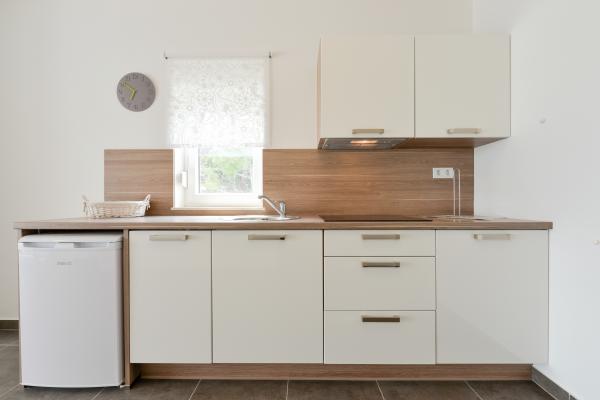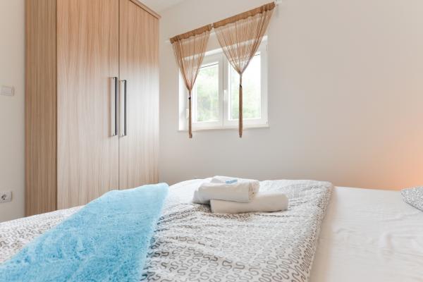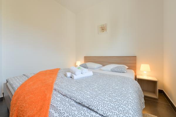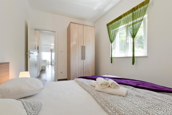 In unserem neugebautem Ferienhaus erwarten Sie 4 komfortabel eingerichtete Apartments mit je 40 m2 für je bis zu 4 Personen. Parkmöglichkeiten befinden sich von dem Haus. Die im Schatten gelegenen Terassen laden zum Grillen, ausruhen oder auch gemütlichen Abenden ein. Eine unbefahrene Strasse reilt Sie vom naheliegenden Kiesstrand, für den wir Ihnen gerne Sonnenliegen wie auch Sonnenliegen wie auch Sonnenschirme zur Verfügang stellen. Die Apartments sind stets sauber und bezugsfertig. Bars, Restaurants, Einkaufsläden sowie Post und Apotheke befinden sich 500m vom Haus entfernt.