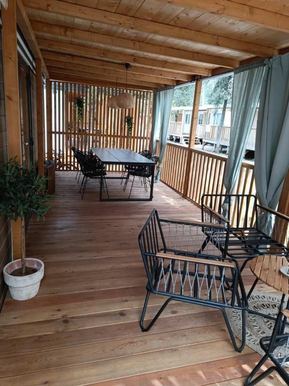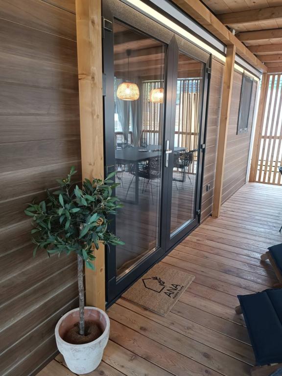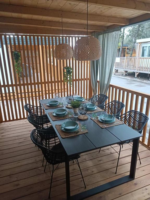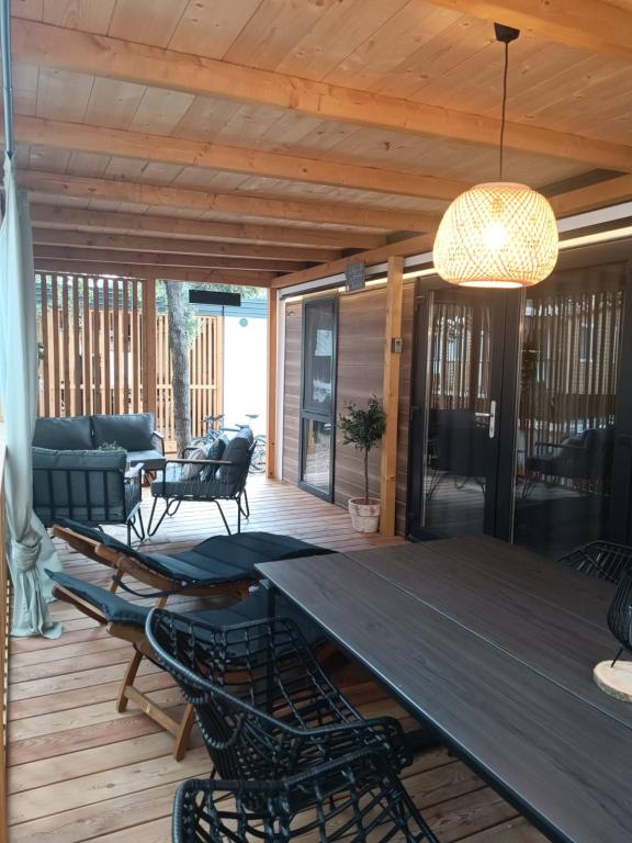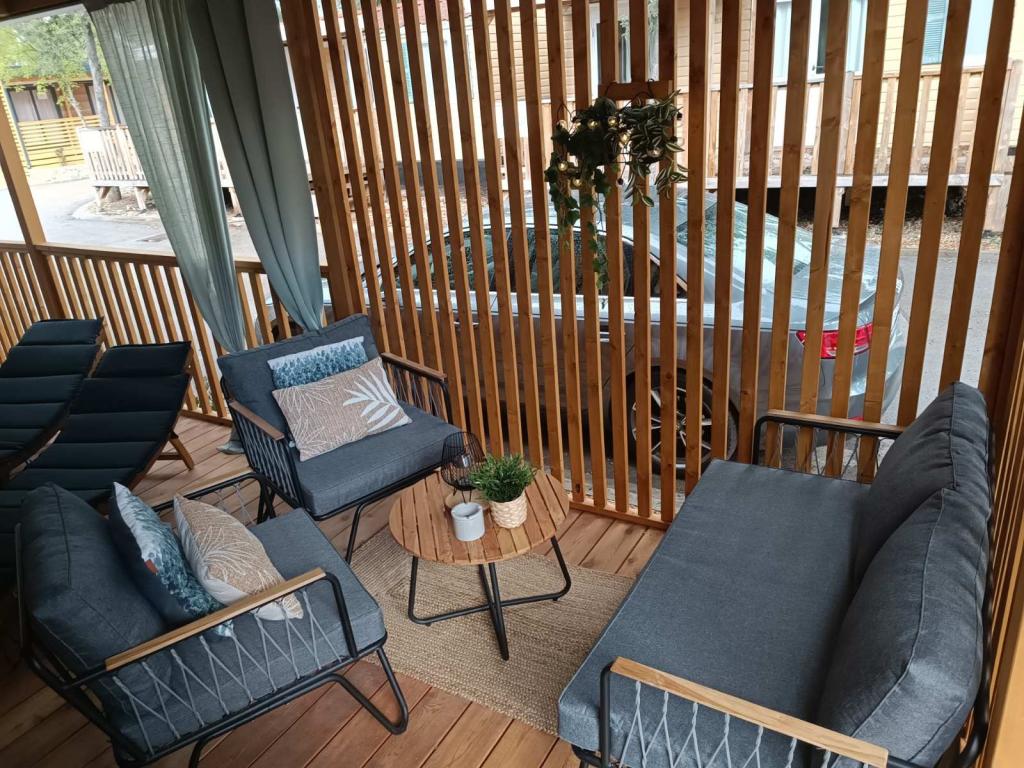 Das moderne Mobilheim InnMare 1 liegt in einem ruhigen Teil des Campingplatzes Soline, inmitten eines Pinienwaldes, und ist der perfekte Ort für einen Familienurlaub. Auf 32 m² bietet es ein Schlafzimmer mit Doppelbett, ein Schlafzimmer mit zwei Einzelbetten, ein Wohnzimmer mit Schlafcouch (1-2 Personen), zwei separate Badezimmer mit WC, eine 32 m² große Terrasse, einen kleinen Hof und einen Parkplatz. Das Haus ist komplett möbliert. Die Küche ist neben der Standardausstattung mit Mikrowelle, Wasserkocher und Espressomaschine ausgestattet. Auf der Terrasse laden ein Esstisch und Liegestühle zum Entspannen im Duft der Pinien zum Verweilen ein. Direkt neben dem Haus befindet sich ein Grill, der ebenfalls zur Ausstattung gehört. Ein Parkplatz für ein Fahrzeug steht Ihnen ebenfalls zur Verfügung. Willkommen im InnMare 1, einem modernen Ferienhaus für einen ruhigen und idyllischen Familienurlaub in einem friedlichen Pinienwald, nur wenige Schritte vom Meer, den Stränden und Biograd na moru entfernt!
