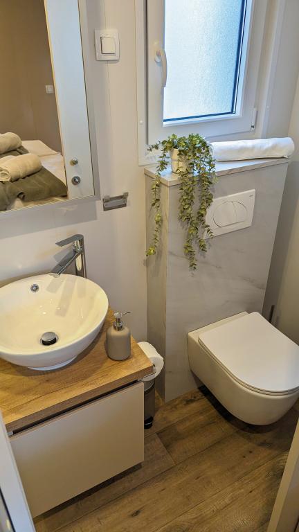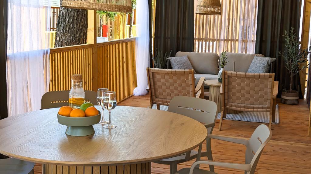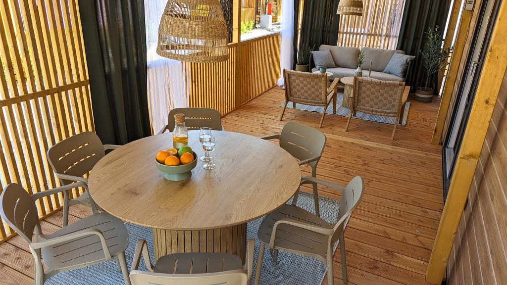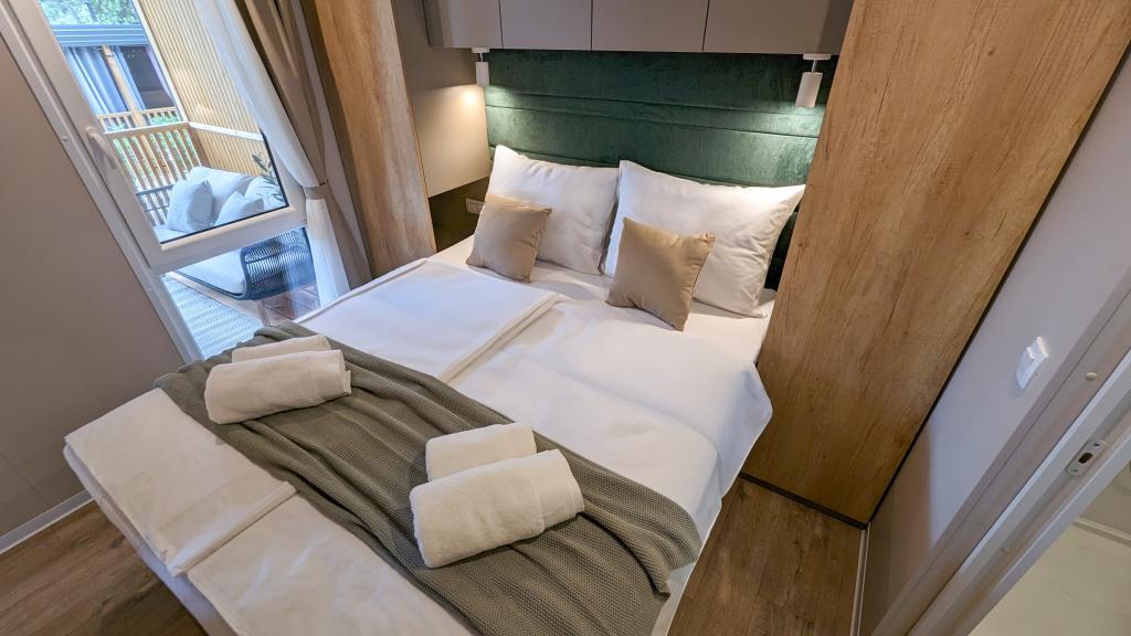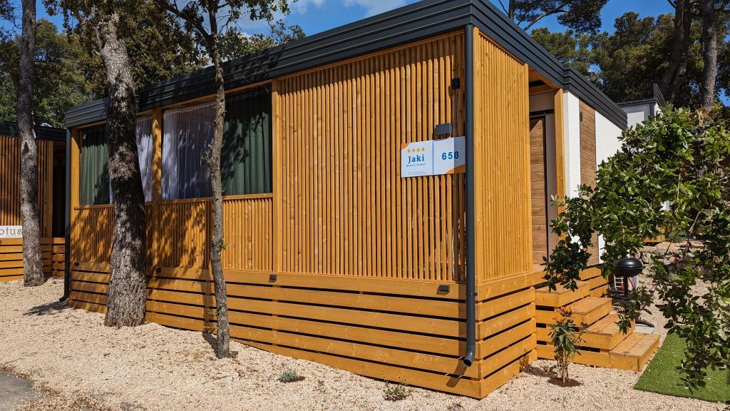 Genießen Sie Natur und Komfort: Die Jaki Mobilheime auf dem Campingplatz Soline in Biograd na Moru. In ruhiger Lage auf dem 4-Sterne-Campingplatz, umgeben von Pinienwäldern, bieten unsere modern ausgestatteten Mobilheime Platz für bis zu 6 Personen. Der Strand (2-5 Gehminuten), Geschäfte und Restaurants sowie die Promenade, die ins Stadtzentrum führt (15 Minuten), sind bequem zu erreichen. Die Mobilheime verfügen über 2 Schlafzimmer, 2 Badezimmer, ein Wohnzimmer, eine große Terrasse mit Esstisch und Sitzecke sowie eine voll ausgestattete Küche mit Geschirrspüler, Mikrowelle, Kaffeemaschine, Toaster, Mixer und Außengrill. Kostenloses WLAN, kostenlose Parkplätze direkt am Haus, Smart-TV, Klimaanlage, Handtücher und Bettwäsche sind ebenfalls vorhanden. Der Campingplatz bietet zahlreiche Einrichtungen für die ganze Familie: wunderschöne Sand- und Kiesstrände, die sich bis ins Stadtzentrum erstrecken, ein Restaurant mit mediterranen Spezialitäten, einen Kinderspielplatz, Sportmöglichkeiten und einen Fahrradverleih. Dalmaland, Kroatiens größter Themenwasserpark, ist nur 15 Autominuten entfernt.