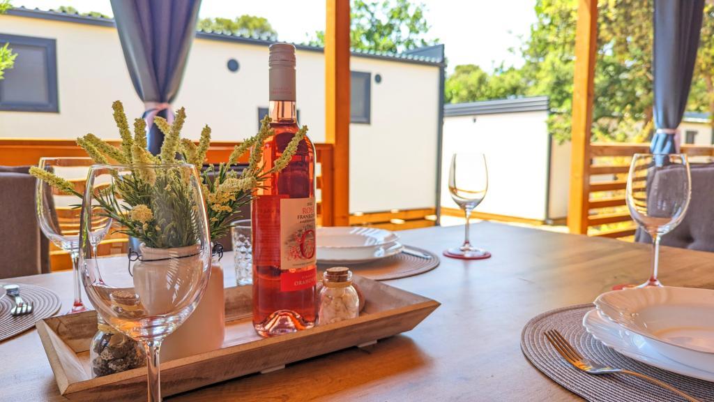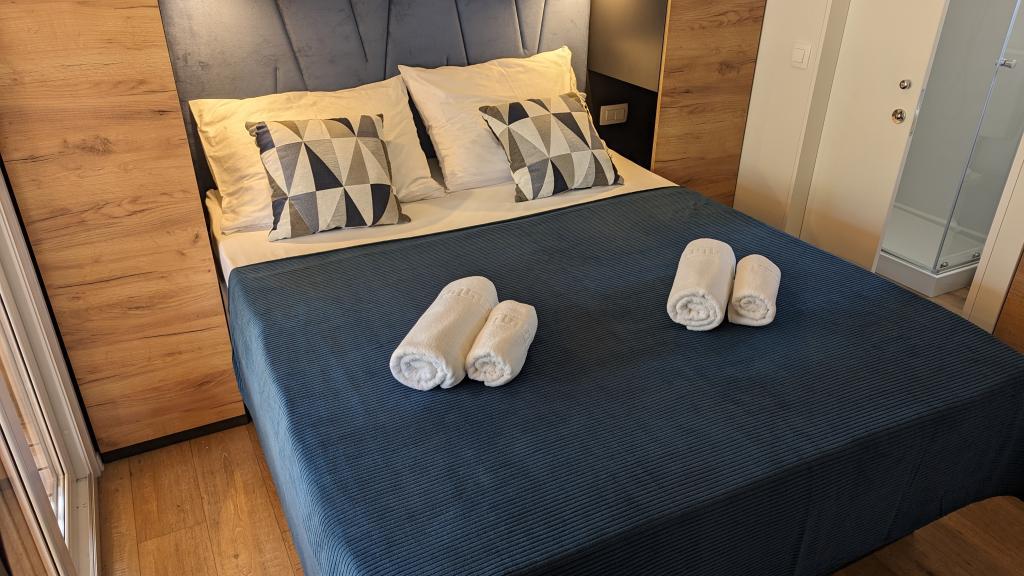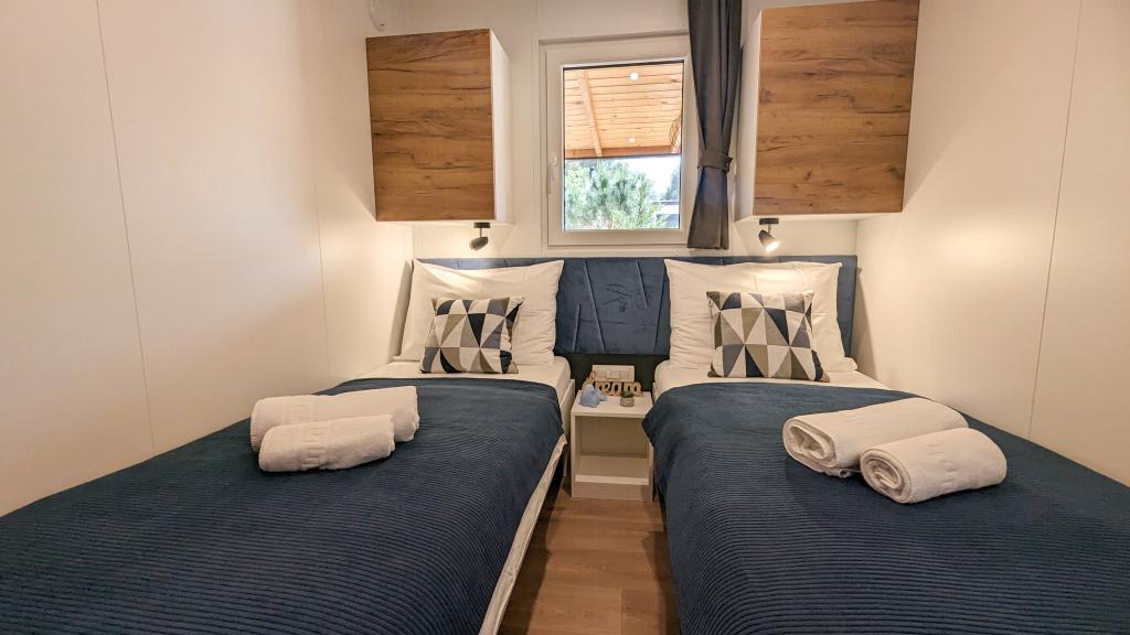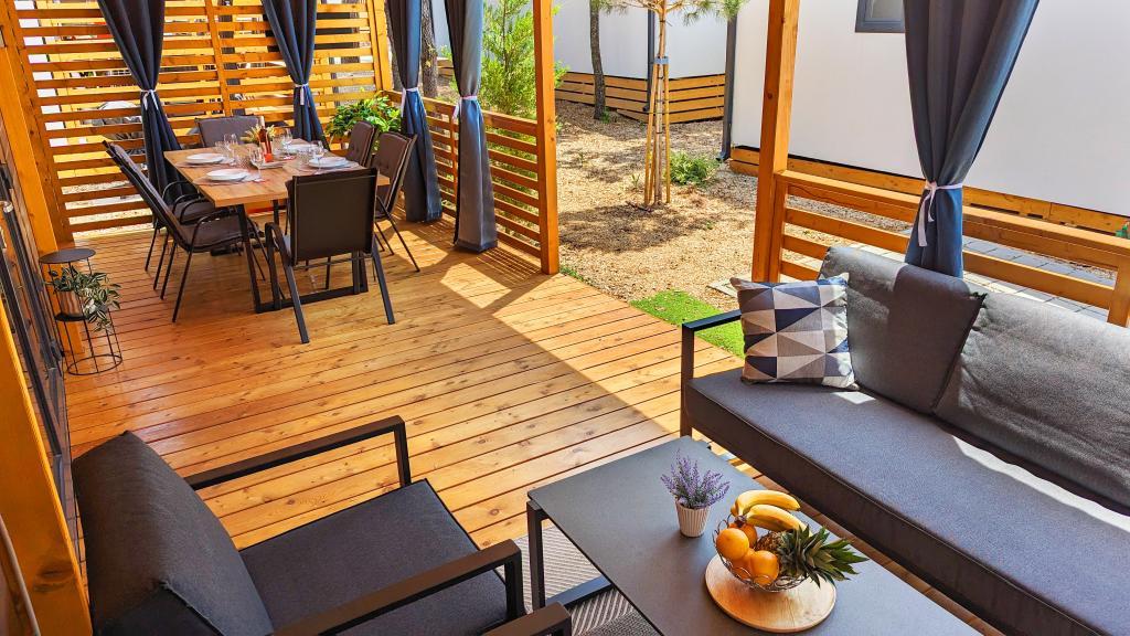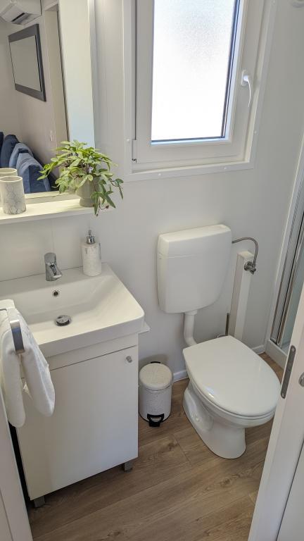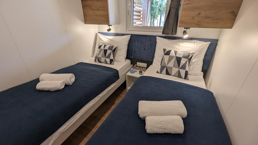 Genießen Sie Natur und Komfort: Die Jaki Mobilheime auf dem Campingplatz Soline in Biograd na Moru. In ruhiger Lage auf dem 4-Sterne-Campingplatz, umgeben von Pinienwäldern, bieten unsere modern ausgestatteten Mobilheime Platz für bis zu 6 Personen. Der Strand (2-5 Gehminuten), Geschäfte und Restaurants sowie die Promenade, die ins Stadtzentrum führt (15 Minuten), sind bequem zu erreichen. Die Mobilheime verfügen über 2 Schlafzimmer, 2 Badezimmer, ein Wohnzimmer, eine große Terrasse mit Esstisch und Sitzecke sowie eine voll ausgestattete Küche mit Geschirrspüler, Mikrowelle, Kaffeemaschine, Toaster, Mixer und Außengrill. Kostenloses WLAN, kostenlose Parkplätze direkt am Haus, Smart-TV, Klimaanlage, Handtücher und Bettwäsche sind ebenfalls vorhanden. Der Campingplatz bietet zahlreiche Einrichtungen für die ganze Familie: wunderschöne Sand- und Kiesstrände, die sich bis ins Stadtzentrum erstrecken, ein Restaurant mit mediterranen Spezialitäten, einen Kinderspielplatz, Sportmöglichkeiten und einen Fahrradverleih. Dalmaland, Kroatiens größter Themenwasserpark, ist nur 15 Autominuten entfernt.