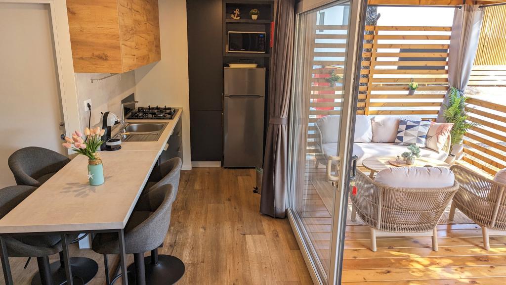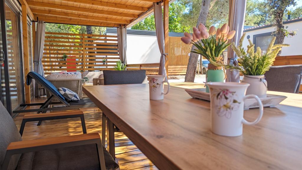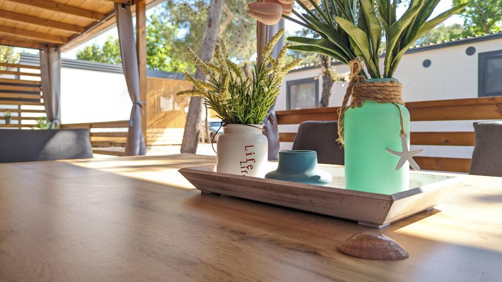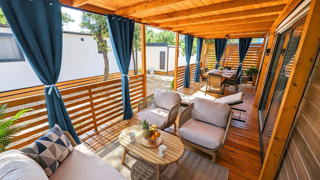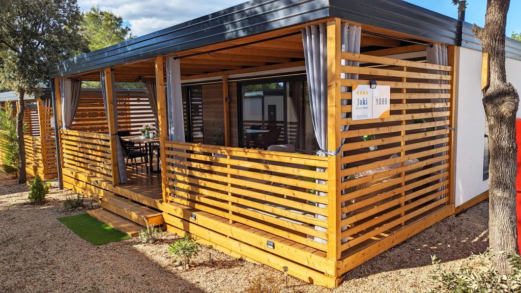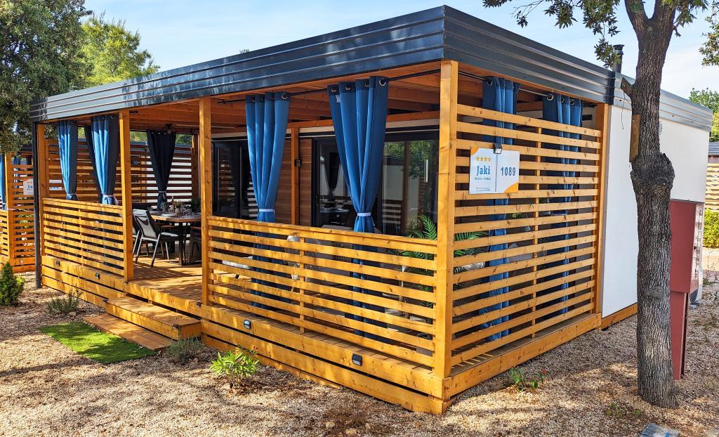 Genießen Sie Natur und Komfort: Die Jaki Mobilheime auf dem Campingplatz Soline in Biograd na Moru. In ruhiger Lage auf dem 4-Sterne-Campingplatz, umgeben von Pinienwäldern, bieten unsere modern ausgestatteten Mobilheime Platz für bis zu 6 Personen. Der Strand (2-5 Gehminuten), Geschäfte und Restaurants sowie die Promenade, die ins Stadtzentrum führt (15 Minuten), sind bequem zu erreichen. Die Mobilheime verfügen über 2 Schlafzimmer, 2 Badezimmer, ein Wohnzimmer, eine große Terrasse mit Esstisch und Sitzecke sowie eine voll ausgestattete Küche mit Geschirrspüler, Mikrowelle, Kaffeemaschine, Toaster, Mixer und Außengrill. Kostenloses WLAN, kostenlose Parkplätze direkt am Haus, Smart-TV, Klimaanlage, Handtücher und Bettwäsche sind ebenfalls vorhanden. Der Campingplatz bietet zahlreiche Einrichtungen für die ganze Familie: wunderschöne Sand- und Kiesstrände, die sich bis ins Stadtzentrum erstrecken, ein Restaurant mit mediterranen Spezialitäten, einen Kinderspielplatz, Sportmöglichkeiten und einen Fahrradverleih. Dalmaland, Kroatiens größter Themenwasserpark, ist nur 15 Autominuten entfernt.