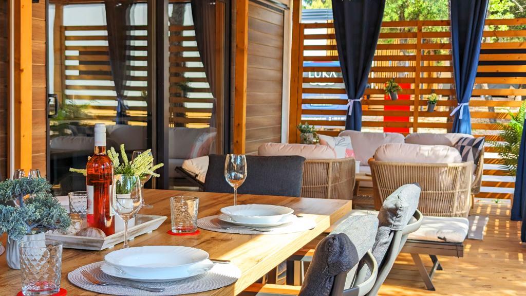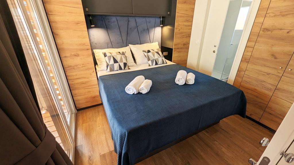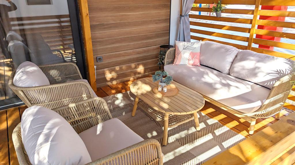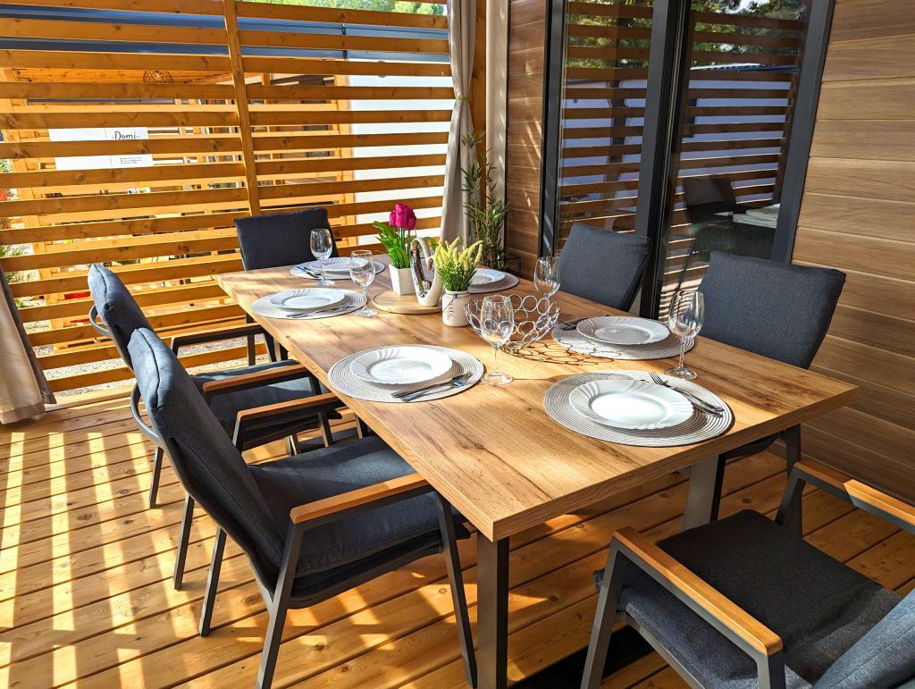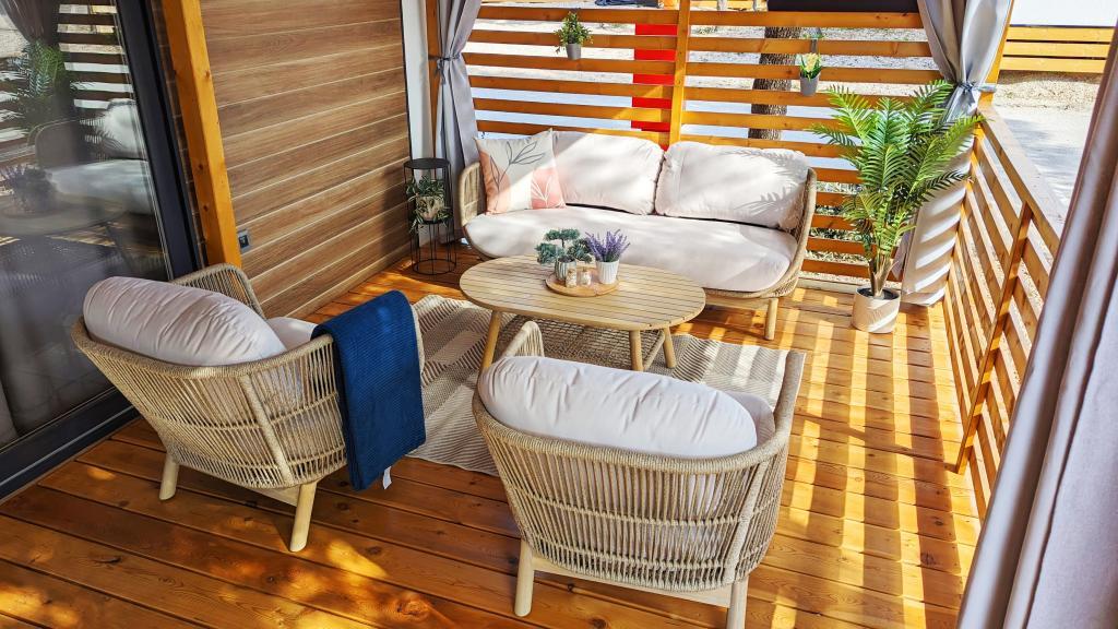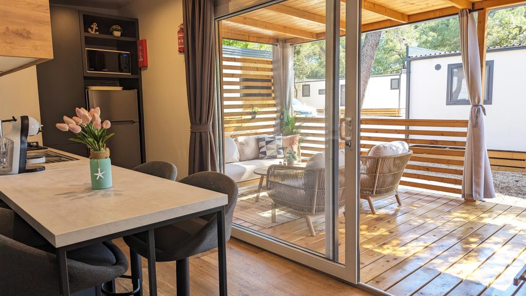 Genießen Sie Natur und Komfort: Die Jaki Mobilheime auf dem Campingplatz Soline in Biograd na Moru. In ruhiger Lage auf dem 4-Sterne-Campingplatz, umgeben von Pinienwäldern, bieten unsere modern ausgestatteten Mobilheime Platz für bis zu 6 Personen. Der Strand (2-5 Gehminuten), Geschäfte und Restaurants sowie die Promenade, die ins Stadtzentrum führt (15 Minuten), sind bequem zu erreichen. Die Mobilheime verfügen über 2 Schlafzimmer, 2 Badezimmer, ein Wohnzimmer, eine große Terrasse mit Esstisch und Sitzecke sowie eine voll ausgestattete Küche mit Geschirrspüler, Mikrowelle, Kaffeemaschine, Toaster, Mixer und Außengrill. Kostenloses WLAN, kostenlose Parkplätze direkt am Haus, Smart-TV, Klimaanlage, Handtücher und Bettwäsche sind ebenfalls vorhanden. Der Campingplatz bietet zahlreiche Einrichtungen für die ganze Familie: wunderschöne Sand- und Kiesstrände, die sich bis ins Stadtzentrum erstrecken, ein Restaurant mit mediterranen Spezialitäten, einen Kinderspielplatz, Sportmöglichkeiten und einen Fahrradverleih. Dalmaland, Kroatiens größter Themenwasserpark, ist nur 15 Autominuten entfernt.
