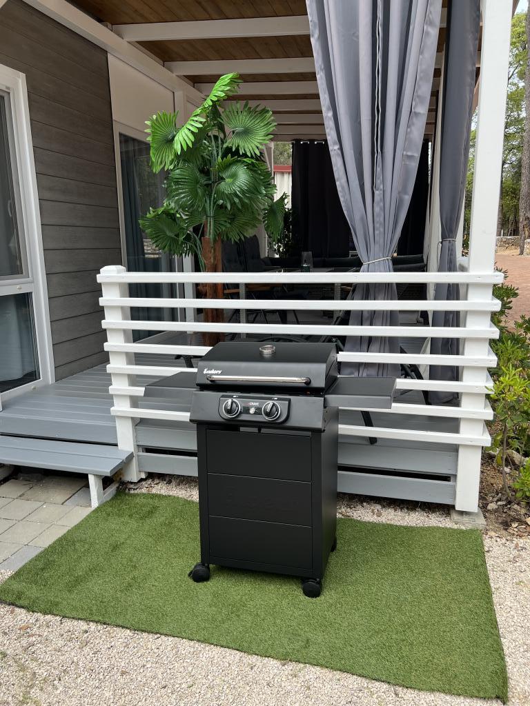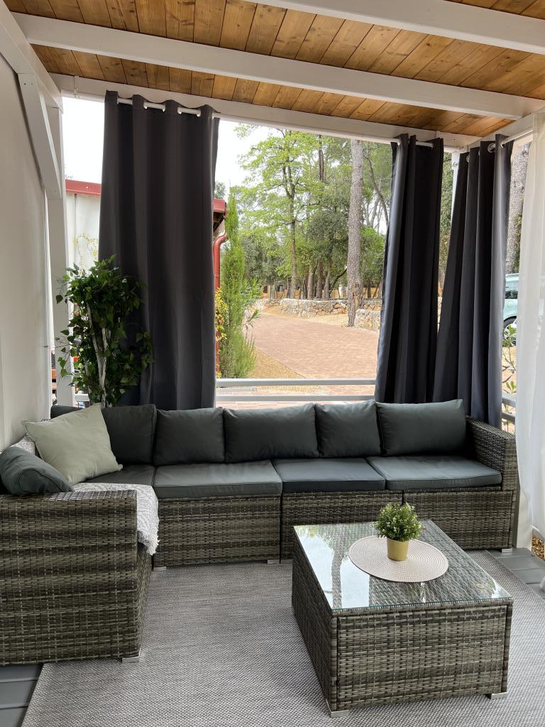 Das Haus umfasst: 2 Schlafzimmer, Küche (mit Wechselrichter), Esszimmer, ein Badezimmer, eine überdachte, voll ausgestattete Terrasse (32 m²), Babybett, Hochstuhl, Föhn, Kaffeemaschine, Wasserkocher, Grill, Toaster, Mikrowelle, Bügeleisen, Handtücher, Bettwäsche, Eierkocher, Küchenmaschine, Staubsauger.