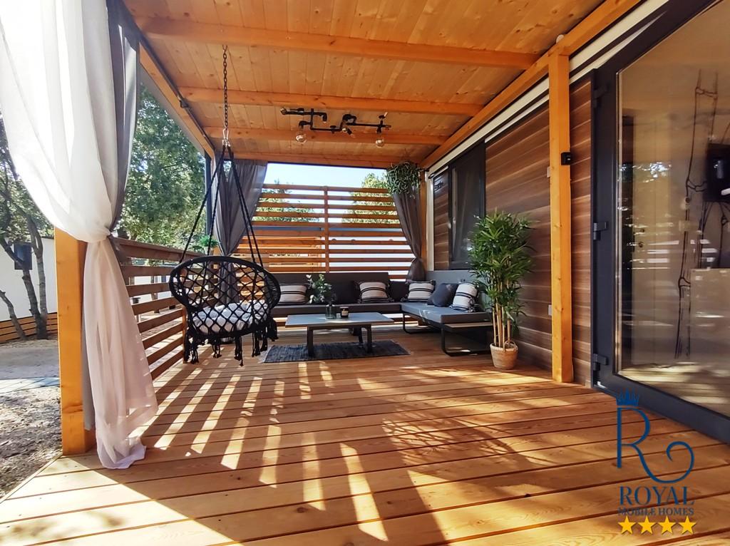 Mobilheim Royal R, modernes Design für einen idealen Sommerurlaub. 2 Schlafzimmer, 2 Badezimmer, Bettwäsche und Handtücher vorhanden. Küche, Esszimmer und Wohnzimmer im zentralen Teil. Es bietet Platz für 4+2 Personen. Ausgestattet mit einer Küche, TV, Klimaanlage und WLAN. Holzterrasse von 24 m² mit Ecksofa, Schaukel und großem Tisch. Im Hof gibt es Liegestühle, einen Tisch und einen Gasgrill. Das Hotel liegt in einem ruhigen Teil des Kamp Park Soline, 5 Minuten vom Meer entfernt. Das Camp ist von einem Pinienwald umgeben und in der Nähe befindet sich ein Strand. In der Nähe des Zentrums von Biograd und attraktiver Strände entlang einer Promenade mit vielen Einrichtungen
