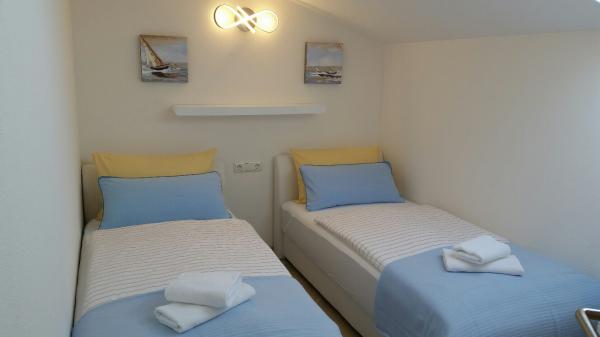 Villa Nikaraoni auf der Insel Ciovo in der Nähe von Trogir. Die modernen und voll ausgestatteten Apartments im neuen Haus mit nur 4 Wohnungen (Erdgeschoss, erster Stock und Dachgeschoss). Das Haus liegt an einem ruhigen und sonnigen, mit vielen Grün im geräumigen Hof (1000 m2). Im Hof sind Parkplätze und Grill. Die Balkone sind geräumig und mit Blick auf das Meer. Die Appartements sind ausgestattet mit neuen und modernen Küchen mit Geschirrspüler, Mikrowelle, großem Kühlschrank, Sat-TV, verfügt über kostenloses WLAN, eine Waschmaschine ... Der Preis Bettwäsche und Handtücher (nicht Strand) und Reinigung.