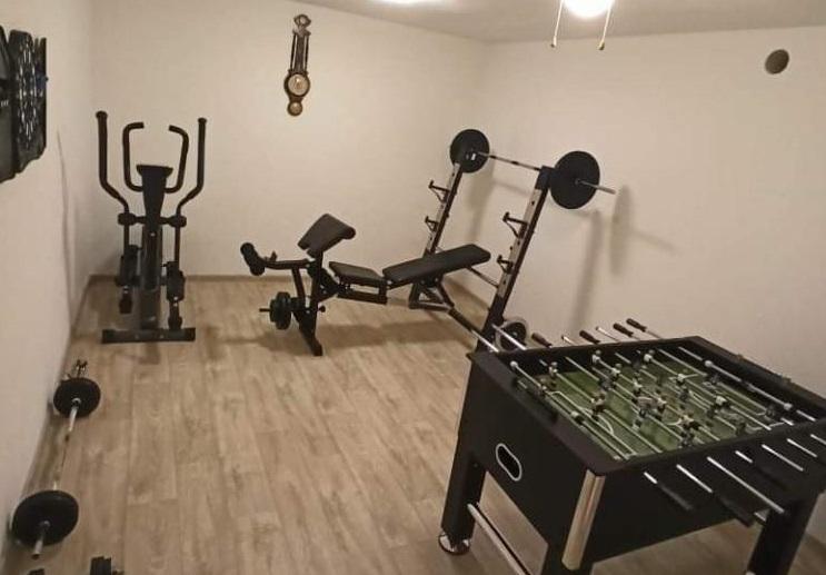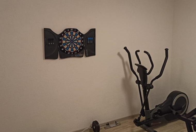 Der im Preis inbegriffene Unterhaltungs- und Fitnessraum im Untergeschoss ist mit Fitnessgeräten, einem Ellipsentrainer, Tischfußball, Darts und einem Fahrrad ausgestattet – ideal für Erholung und Familienspaß.