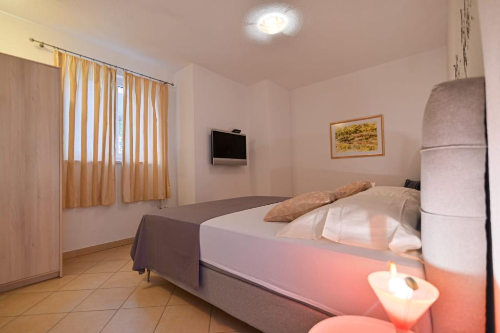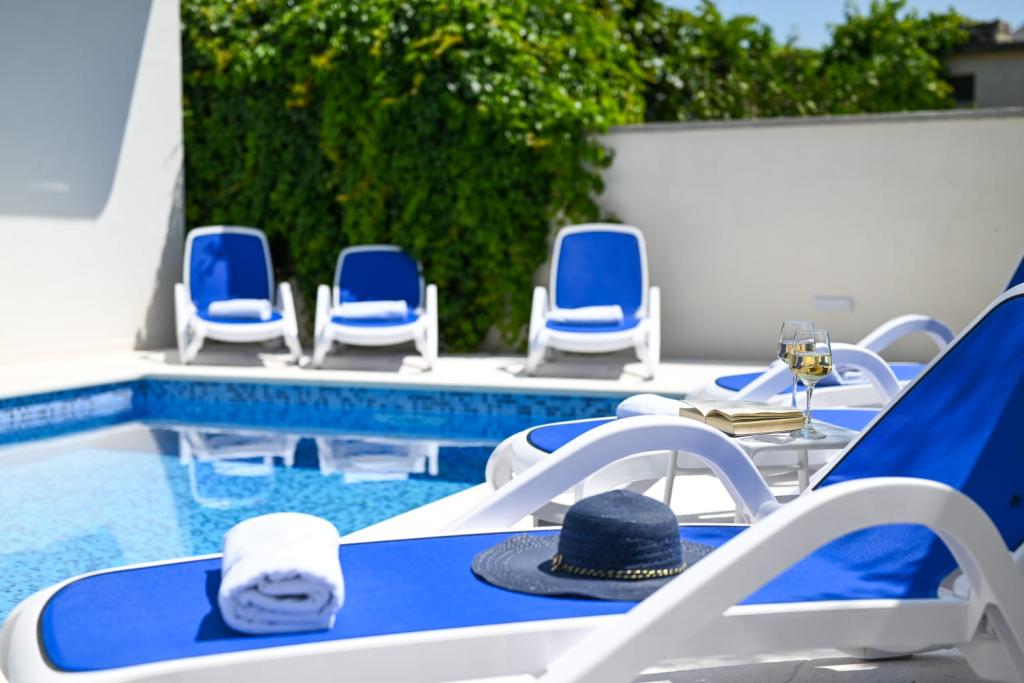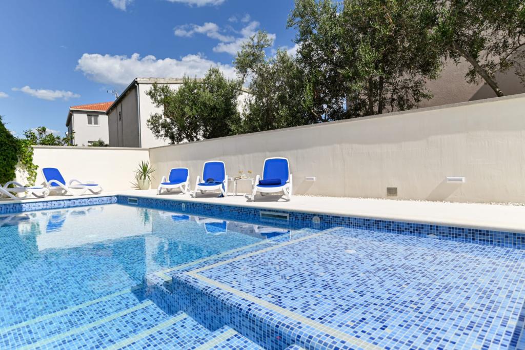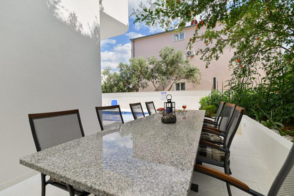 Auf der Südseite der Insel Čiovo, die durch zwei Brücken mit der alten und historischen Stadt Trogir und dem Festland verbunden ist, 200 m vom kristallklaren Meer und dem Strand entfernt, bieten wir Ihnen ein voll ausgestattetes Apartment mit privatem Pool . Die Wohnung mit zwei Schlafzimmern befindet sich im Erdgeschoss, davor befindet sich ein privater Pool und Grill. Parkplätze stehen innerhalb des Gebäudes zur Verfügung.