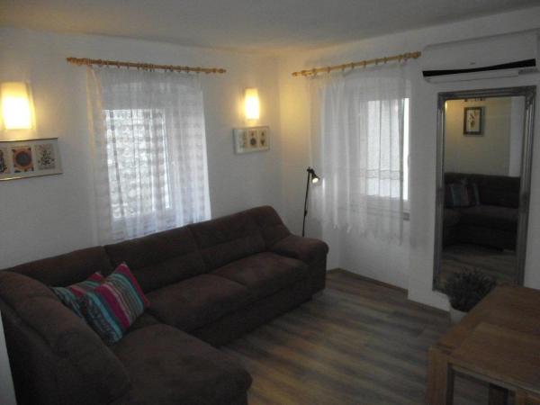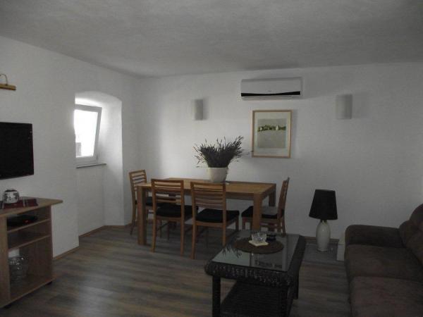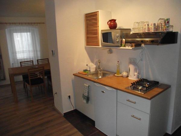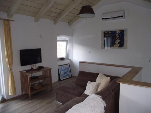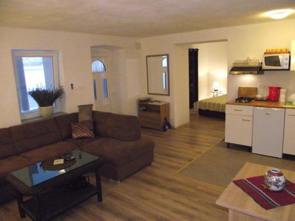 Die Apartments befinden sich in eine zweistöckiges Sezzesion Haus in der Mitte der Städtchen und waren in der ersten Hälfte des 2012 komplett renoviert. In der Nähe befindet sich das Geschäft, eine große nationale Restaurant mit Terrasse und Bar, Galerien, Museen und Kirchen. Der kostenlosser, nicht bewachte Parkplatz kann man etwa 200 Meter weiter finden. Haustiere sind mit vorheriger Anmeldung erlaubt . Studio Apartment befindet sich im Erdgeschoss, mit eine Fläche von 40 m2. Vor der Eingnag befindet sich eine überdachte Terrasse, die zum Objekt gehört. Apartment besteht aus einem großen Schlafzimmer mit Ehebett, Wohnzimmer mit Sofabett für zwei Personen und ein Badezimmer mit Dusche und WC. Schlafzimmerboden und Wohnzimmerboden ist mit Holz-Laminat bedeckt. Die Studio Apartment ist mit eine Klimaanlage (Kühlung und Heizung), SAT-TV, Safe, Küche ausgestattet. In Apartments 1 und 2, die sich auf der zweite und dritte Etage befinden, kann man durch eine große sonnige Terrasse