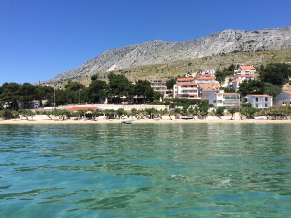 Wir bieten zwei geräumige und gut ausgestattete Apartments mit Meerblick, 50 m vom Sandstrand entfernt. Die Apartments sind für 8 Personen ausgelegt - sie sind ideal für eine Gruppe von Freunden oder Familien mit Kindern. Die Unterkunft bietet kostenlose Parkplätze, WI-Fi, Hof, Grillplatz. Apartment A1 besteht aus vier Doppelzimmern, jedes mit eigenem Bad, großer Terrasse und Küche. In der Küche gibt es eine Mikrowelle, Geschirrspüler, Kühlschrank, Herd. Apartment A2 besteht aus drei Zimmern; Ein Zimmer besteht aus zwei Doppelbetten für vier Personen, das andere ist ein Doppelzimmer und das dritte besteht aus einem Doppelbett und einem Einzelbett. Jedes Zimmer hat ein Badezimmer. Die Wohnung verfügt über eine große Küche und eine Terrasse mit Meerblick. Jedes Apartment verfügt über einen TV im Sitzbereich. Die Unterkunft befindet sich 2 km von der Stadt Omis und nur 50 m vom nächsten Restaurant entfernt. Die Bushaltestelle befindet sich direkt neben dem Haus, was eine gute Verkehrsanbindung an das 20 km entfernte Split bietet.