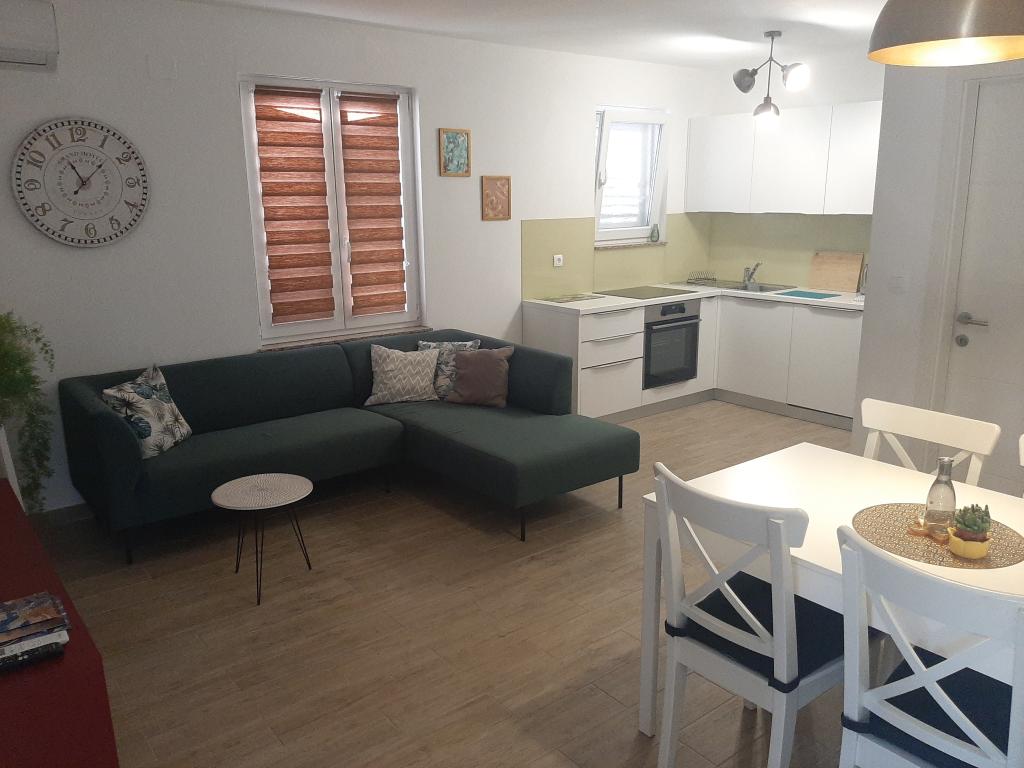Die neu renovierte Wohnung befindet sich im Erdgeschoss eines Einfamilienhauses im Zentrum von Krk. Die Wohnung verfügt über zwei Schlafzimmer, eine reich ausgestattete Küche mit Essbereich, ein Wohnzimmer, ein Badezimmer und eine Terrasse mit Grill. Im Übernachtungspreis sind kostenfreies WLAN und ein Privatparkplatz neben der Anlage inbegriffen. Die Lage der Wohnung ist äußerst attraktiv, da Sie während Ihres Aufenthalts in Krk kein Auto benötigen. Die Wohnung liegt in der Nähe aller notwendigen Einrichtungen, die Sie zu Fuß erreichen können (Strand, Geschäft, Restaurant, Altstadt). Zusätzlich zu den Standardgeräten ist die Wohnung mit einem Geschirrspüler und einer Waschmaschine sowie einer Klimaanlage ausgestattet. Haustiere sind nicht erlaubt.