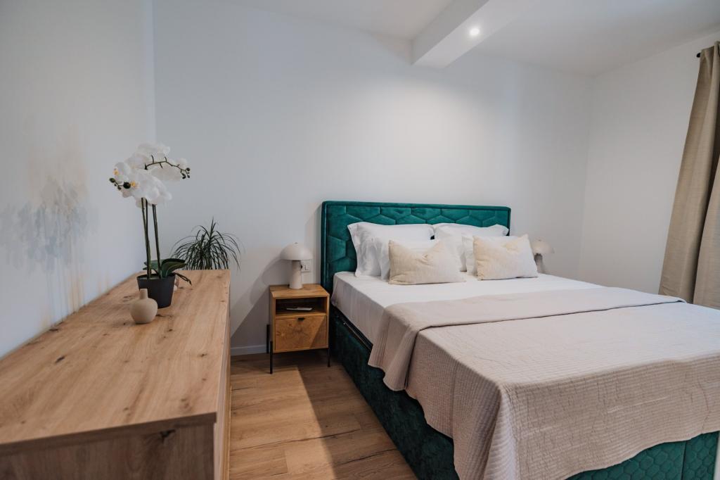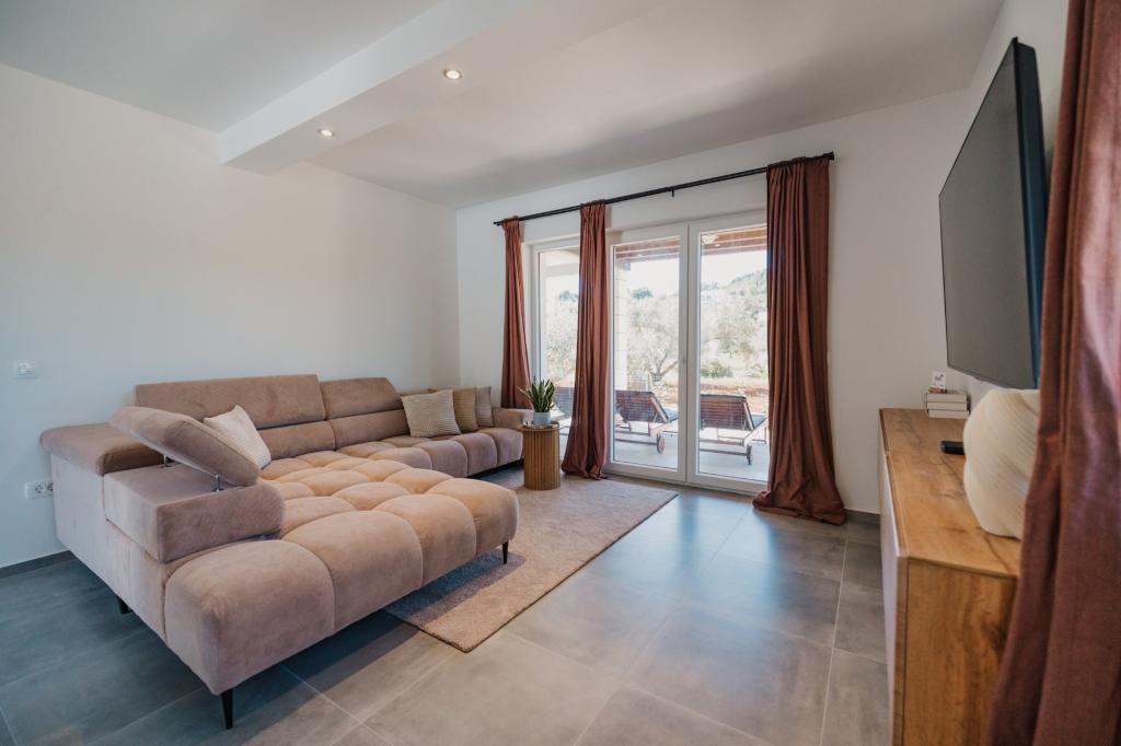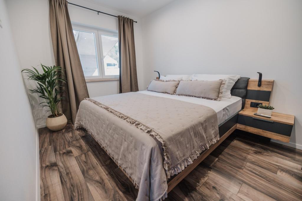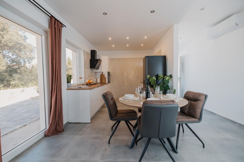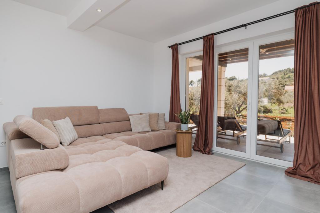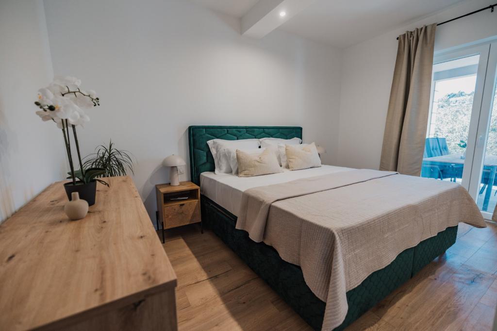 In Lumbarda auf der Insel Korčula steht eine frisch renovierte und modern ausgestattete Ferienwohnung zur Vermietung. Sie liegt inmitten eines weitläufigen Olivenhains und bietet Gästen absolute Ruhe und Privatsphäre. Die 75 Quadratmeter große Wohnung verfügt über zwei Schlafzimmer und zwei Badezimmer. Besonders hervorzuheben ist der Außenbereich mit einer 35 Quadratmeter großen Terrasse und einem 100 Quadratmeter großen Garten – ideal zum Entspannen und Genießen der Ruhe. Die Wohnung ist komplett für einen komfortablen Aufenthalt von vier Personen ausgestattet, unter anderem mit Geschirrspüler in der Küche, Waschmaschine im Badezimmer, MaxTV und schnellem 5G-Internet. Für Familien mit kleinen Kindern stellt das Apartment auf Anfrage ein Kinderbett zur Verfügung. Die Lage bietet die perfekte Kombination aus Privatsphäre und der Nähe zu allen Annehmlichkeiten: Die erste Badebucht ist nur 200 Meter entfernt, das Stadtzentrum 800 Meter und die berühmten, weitläufigen Sandstrände erreichen Sie nach etwa 2 Kilometern. Gästen steht ein privater Parkplatz im Gebäude zur Verfügung.