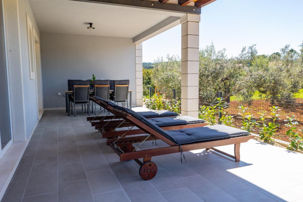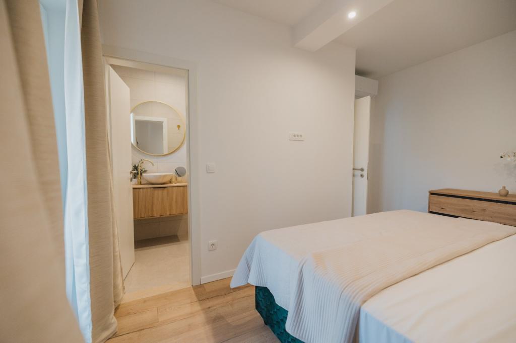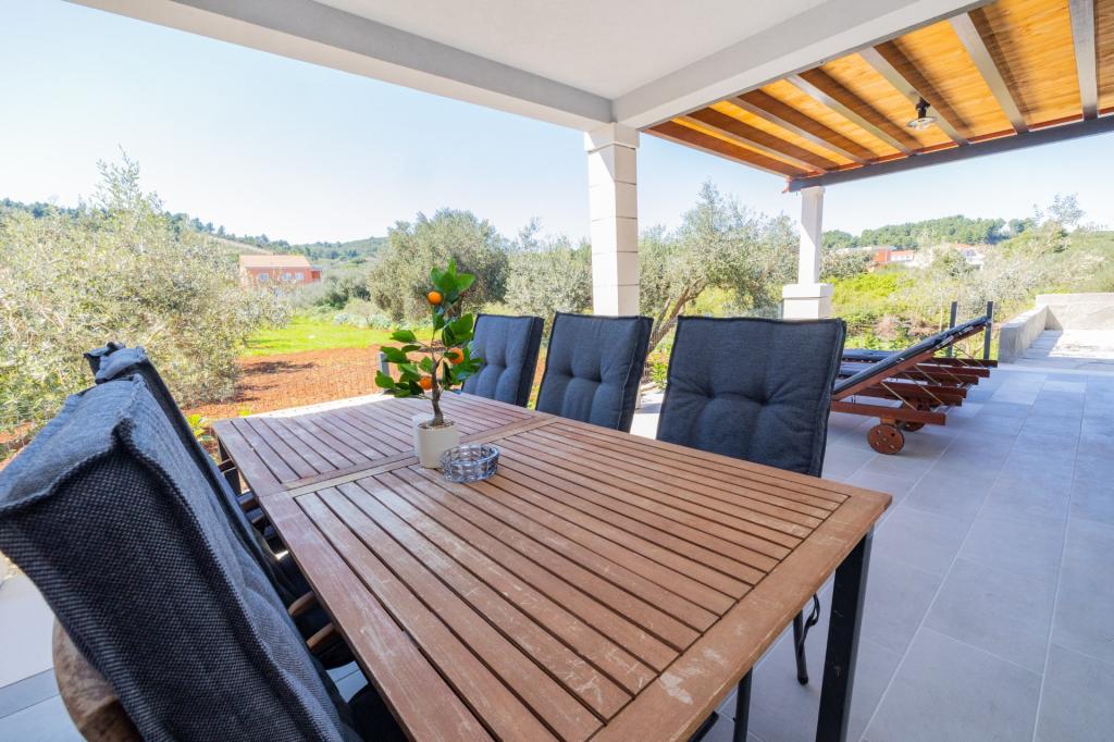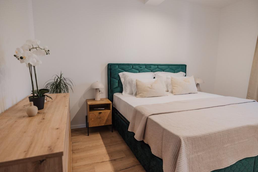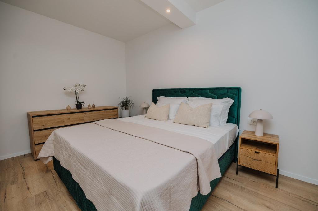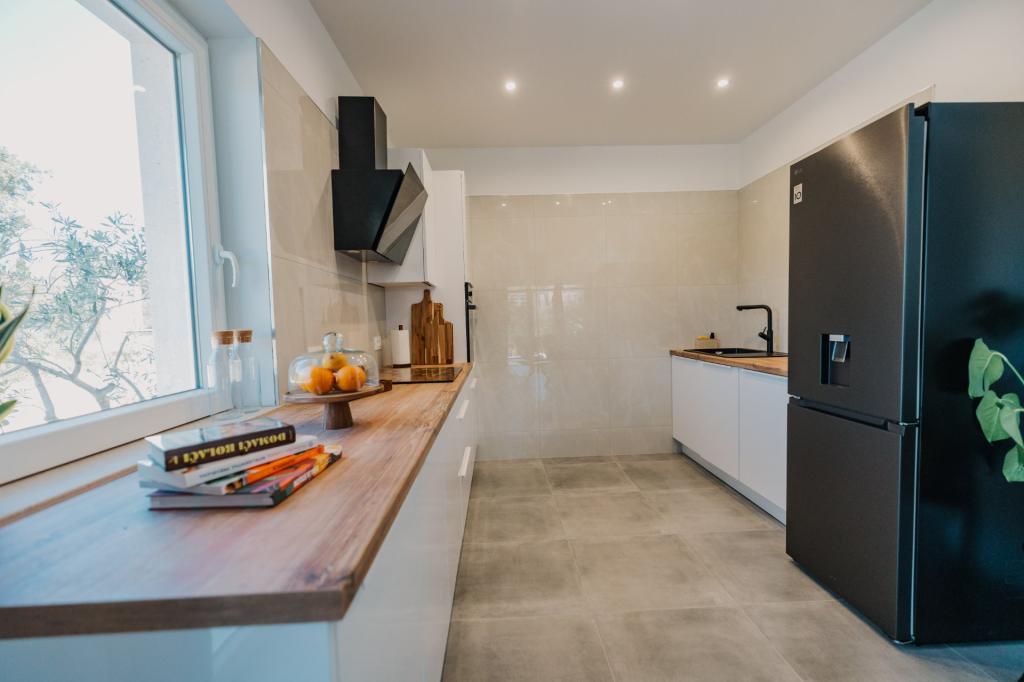 In Lumbarda auf der Insel Korčula steht eine frisch renovierte und modern ausgestattete Ferienwohnung zur Vermietung. Sie liegt inmitten eines weitläufigen Olivenhains und bietet Gästen absolute Ruhe und Privatsphäre. Die 75 Quadratmeter große Wohnung verfügt über zwei Schlafzimmer und zwei Badezimmer. Besonders hervorzuheben ist der Außenbereich mit einer 35 Quadratmeter großen Terrasse und einem 100 Quadratmeter großen Garten – ideal zum Entspannen und Genießen der Ruhe. Die Wohnung ist komplett für einen komfortablen Aufenthalt von vier Personen ausgestattet, unter anderem mit Geschirrspüler in der Küche, Waschmaschine im Badezimmer, MaxTV und schnellem 5G-Internet. Für Familien mit kleinen Kindern stellt das Apartment auf Anfrage ein Kinderbett zur Verfügung. Die Lage bietet die perfekte Kombination aus Privatsphäre und der Nähe zu allen Annehmlichkeiten: Die erste Badebucht ist nur 200 Meter entfernt, das Stadtzentrum 800 Meter und die berühmten, weitläufigen Sandstrände erreichen Sie nach etwa 2 Kilometern. Gästen steht ein privater Parkplatz im Gebäude zur Verfügung.