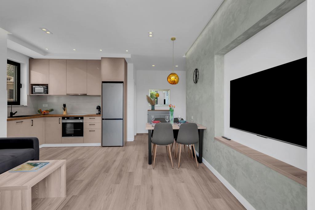 Brandneues, modern eingerichtetes Apartment mit allen Haushaltsgeräten für einen komfortableren Aufenthalt, einschließlich Bettwäsche und Handtüchern. Private Parkplätze stehen innerhalb des Gebäudes zur Verfügung. Die Wohnung ist in allen Räumen klimatisiert. Wir befinden uns in einer ruhigen Gegend in der Nähe eines Kinderspielplatzes und eines Ladens. Der Balkon bietet einen Blick auf den wunderschönen Berg Biokovo und einen Teil der Adria.