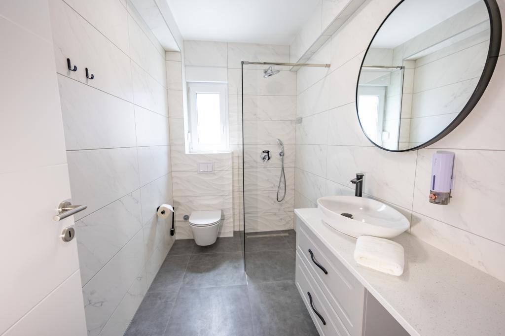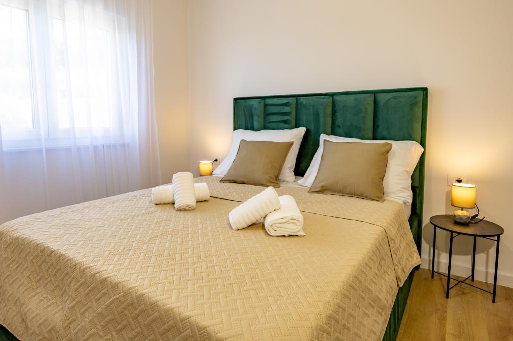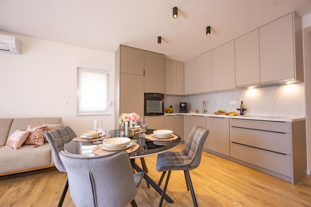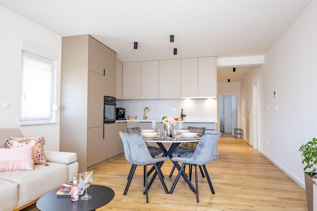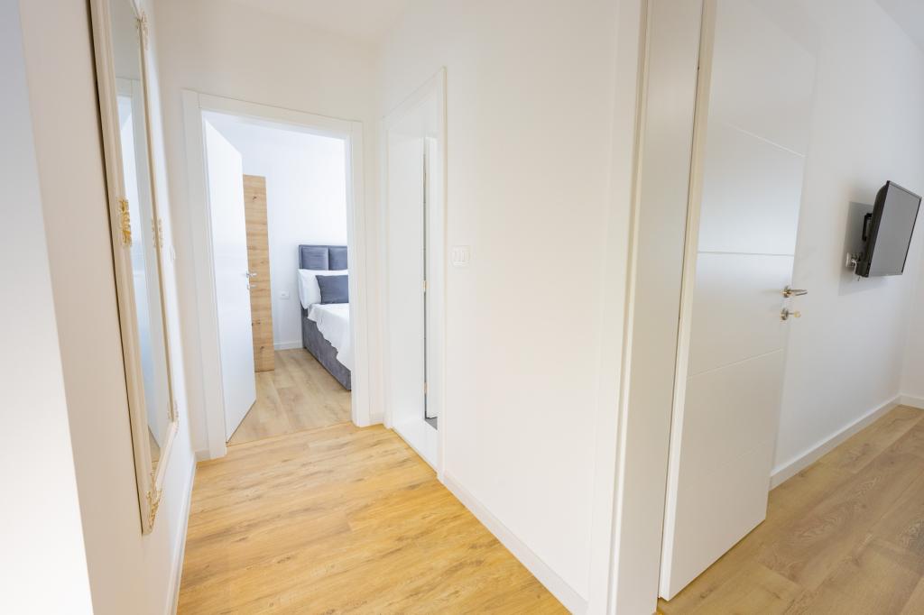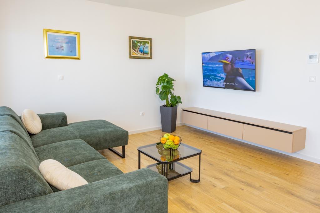 Jedes Apartment besticht durch modernes Design und ein frisch renoviertes Interieur. Im geräumigen Wohnzimmer, geschmackvoll mit Möbeln und modernen Details eingerichtet, werden Sie sich sofort wie zu Hause fühlen. Der offene Wohnbereich verbindet das Wohnzimmer nahtlos mit der voll ausgestatteten Küche, in der elegante Arbeitsplatten, hochwertige Geräte und ausreichend Platz zum Zubereiten Ihrer Lieblingsgerichte auf Sie warten. Vom Wohnbereich gelangen Sie auf einen schönen Balkon – der ideale Ort für den Morgenkaffee oder zum Entspannen am Abend bei einem Glas Wein und einem unvergesslichen Sonnenuntergang über der Adria. Jedes Apartment verfügt über zwei komfortable Schlafzimmer mit Doppelbetten, ausgestattet mit weicher Bettwäsche und viel Stauraum, ein modernes Badezimmer und ein separates WC. Die Apartments sind klimatisiert und komplett ausgestattet: TV/Sat, Internet, Waschmaschine, Geschirrspüler, Kaffeemaschine und alles, was Sie für einen angenehmen und unbeschwerten Aufenthalt benötigen.