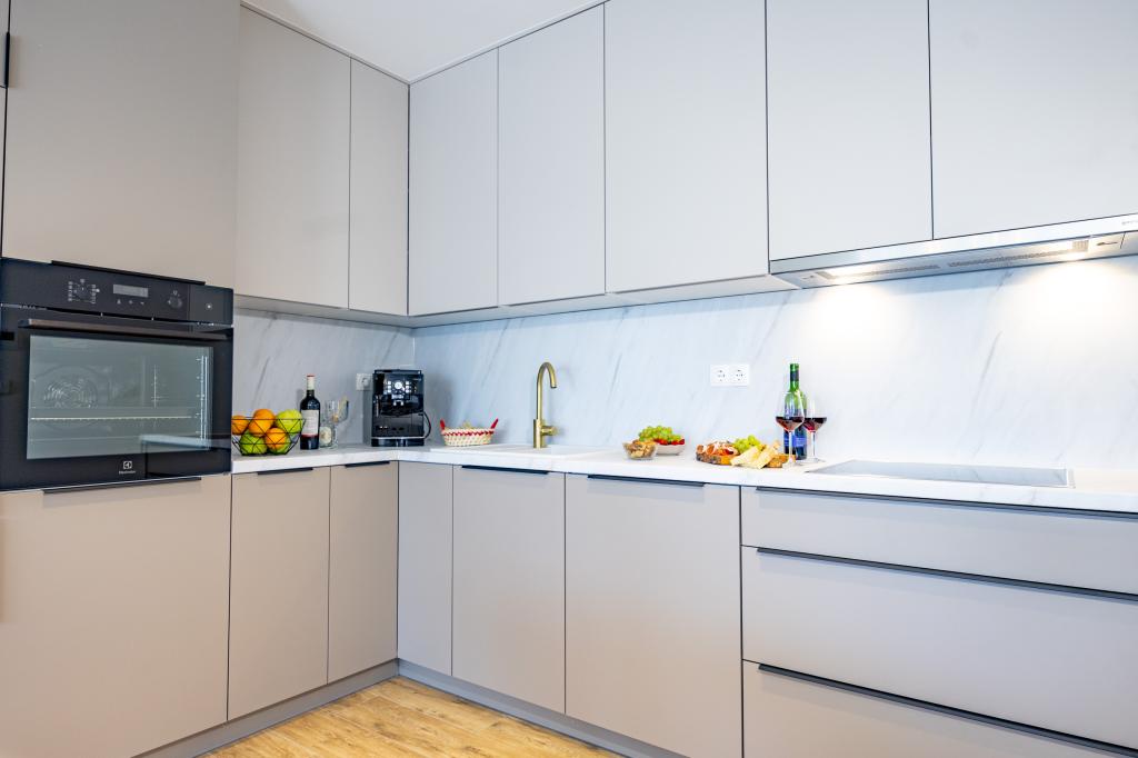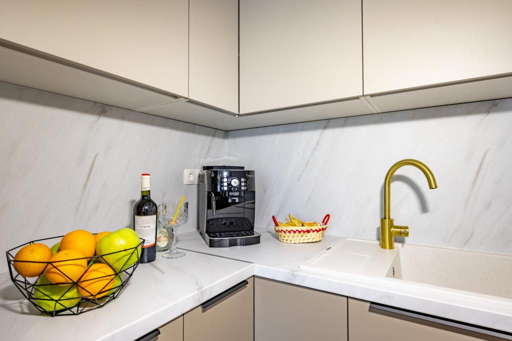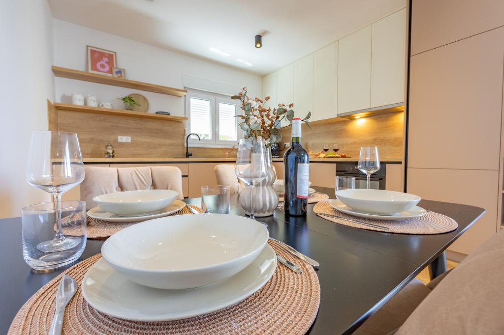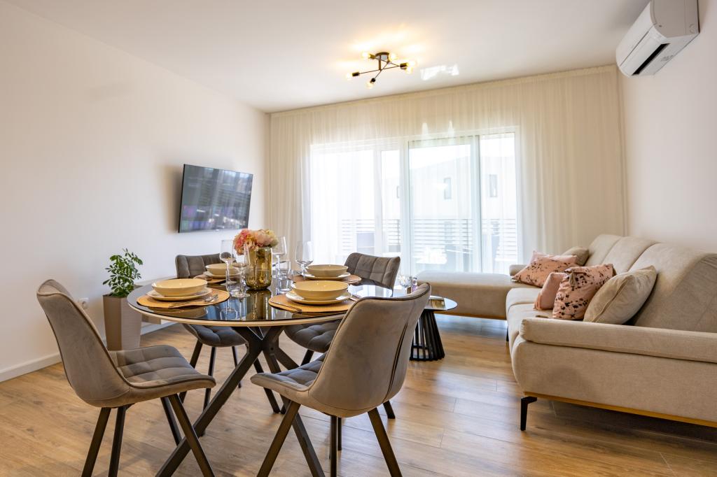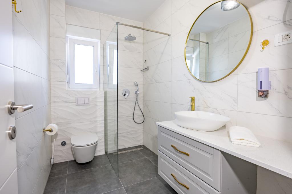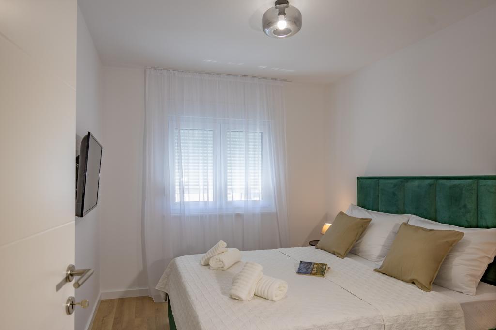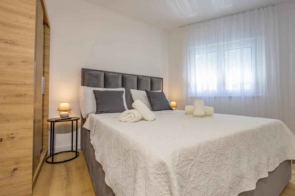 Jedes Apartment besticht durch modernes Design und ein frisch renoviertes Interieur. Im geräumigen Wohnzimmer, geschmackvoll mit Möbeln und modernen Details eingerichtet, werden Sie sich sofort wie zu Hause fühlen. Der offene Wohnbereich verbindet das Wohnzimmer nahtlos mit der voll ausgestatteten Küche, in der elegante Arbeitsplatten, hochwertige Geräte und ausreichend Platz zum Zubereiten Ihrer Lieblingsgerichte auf Sie warten. Vom Wohnbereich gelangen Sie auf einen schönen Balkon – der ideale Ort für den Morgenkaffee oder zum Entspannen am Abend bei einem Glas Wein und einem unvergesslichen Sonnenuntergang über der Adria. Jedes Apartment verfügt über zwei komfortable Schlafzimmer mit Doppelbetten, ausgestattet mit weicher Bettwäsche und viel Stauraum, ein modernes Badezimmer und ein separates WC. Die Apartments sind klimatisiert und komplett ausgestattet: TV/Sat, Internet, Waschmaschine, Geschirrspüler, Kaffeemaschine und alles, was Sie für einen angenehmen und unbeschwerten Aufenthalt benötigen.
