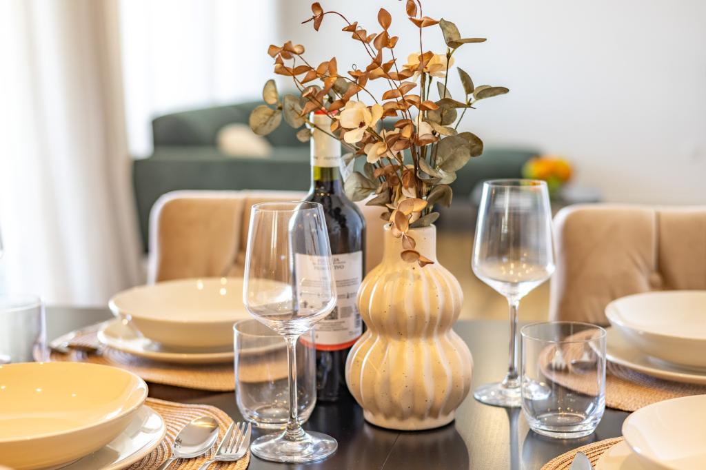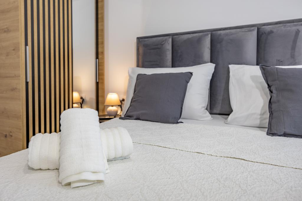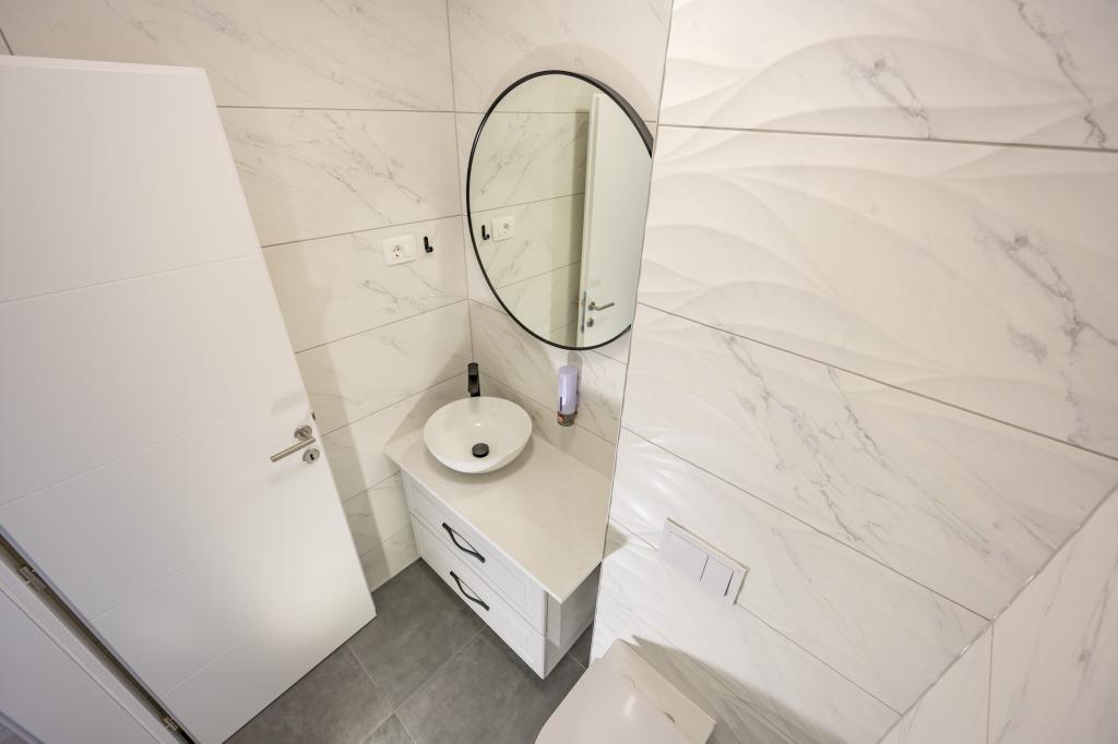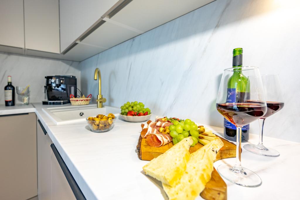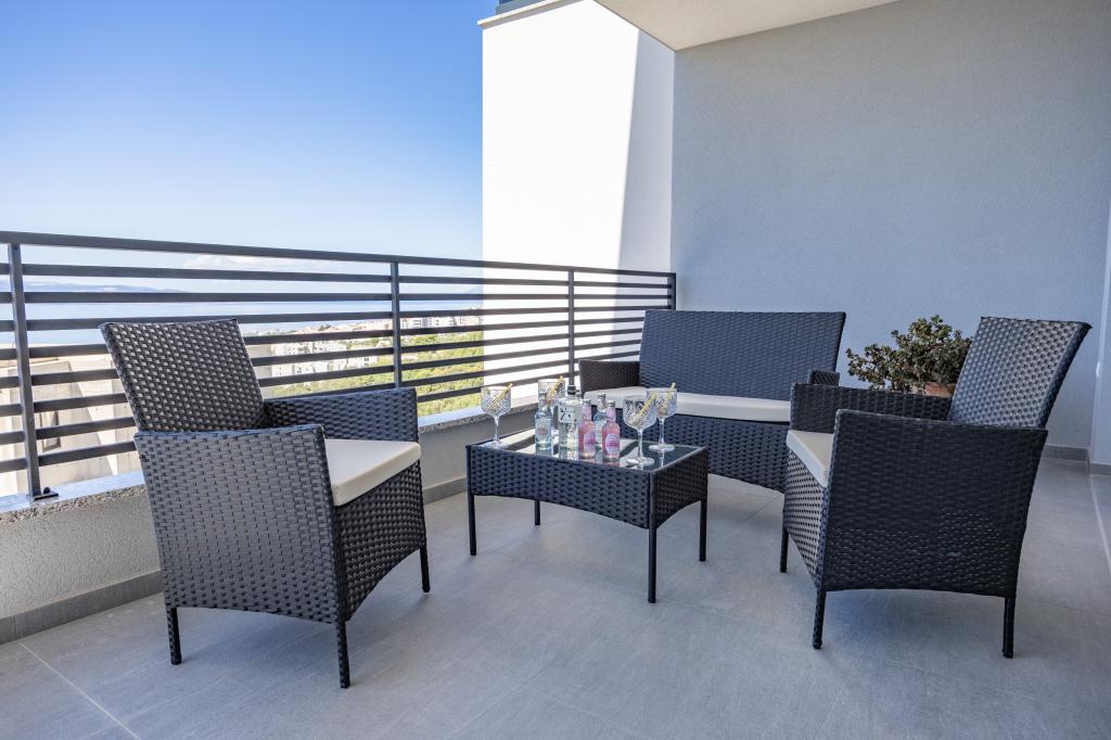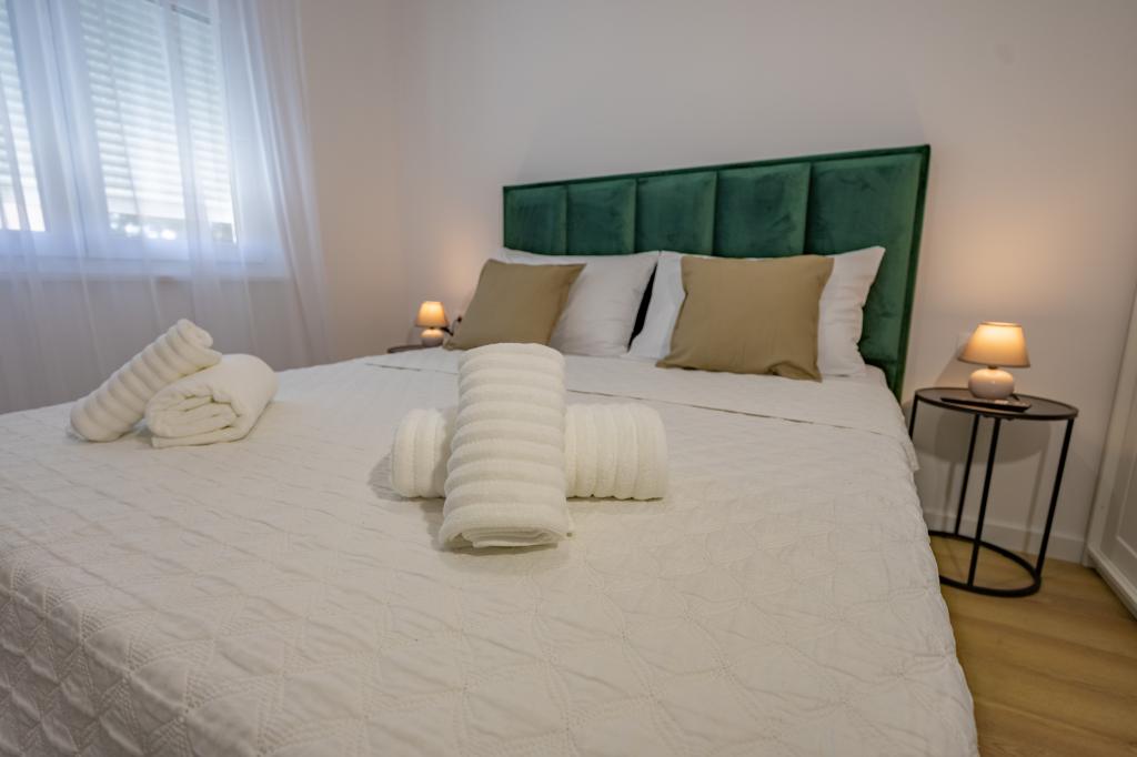 Jedes Apartment besticht durch modernes Design und ein frisch renoviertes Interieur. Im geräumigen Wohnzimmer, geschmackvoll mit Möbeln und modernen Details eingerichtet, werden Sie sich sofort wie zu Hause fühlen. Der offene Wohnbereich verbindet das Wohnzimmer nahtlos mit der voll ausgestatteten Küche, in der elegante Arbeitsplatten, hochwertige Geräte und ausreichend Platz zum Zubereiten Ihrer Lieblingsgerichte auf Sie warten. Vom Wohnbereich gelangen Sie auf einen schönen Balkon – der ideale Ort für den Morgenkaffee oder zum Entspannen am Abend bei einem Glas Wein und einem unvergesslichen Sonnenuntergang über der Adria. Jedes Apartment verfügt über zwei komfortable Schlafzimmer mit Doppelbetten, ausgestattet mit weicher Bettwäsche und viel Stauraum, ein modernes Badezimmer und ein separates WC. Die Apartments sind klimatisiert und komplett ausgestattet: TV/Sat, Internet, Waschmaschine, Geschirrspüler, Kaffeemaschine und alles, was Sie für einen angenehmen und unbeschwerten Aufenthalt benötigen.