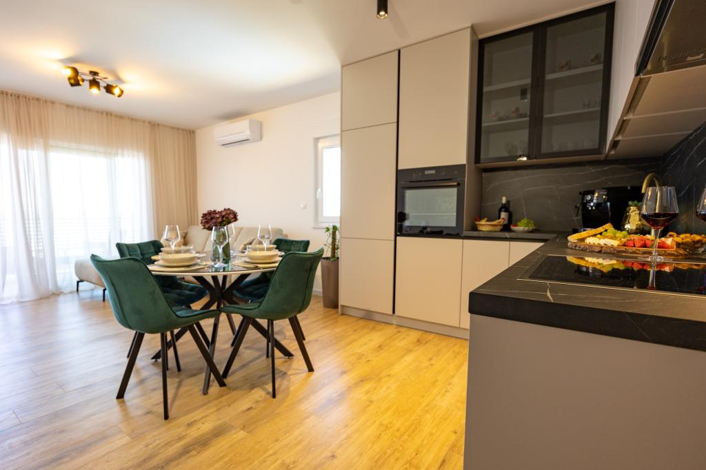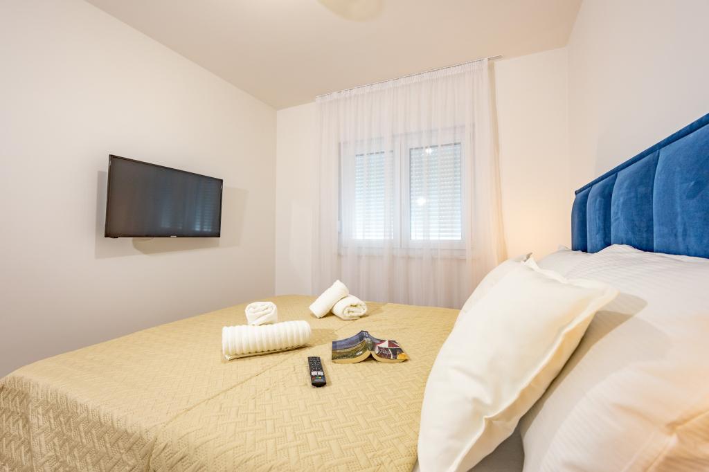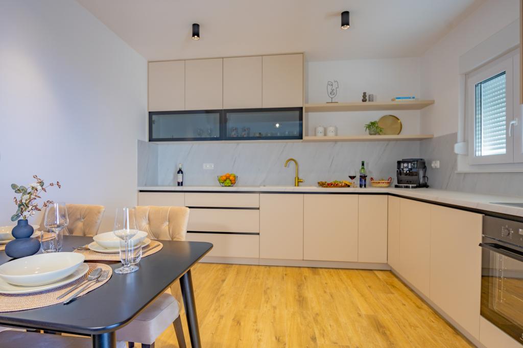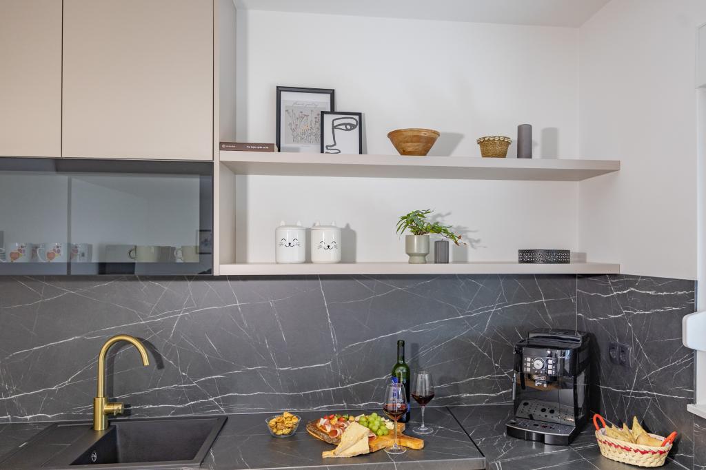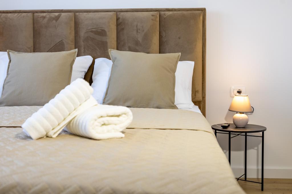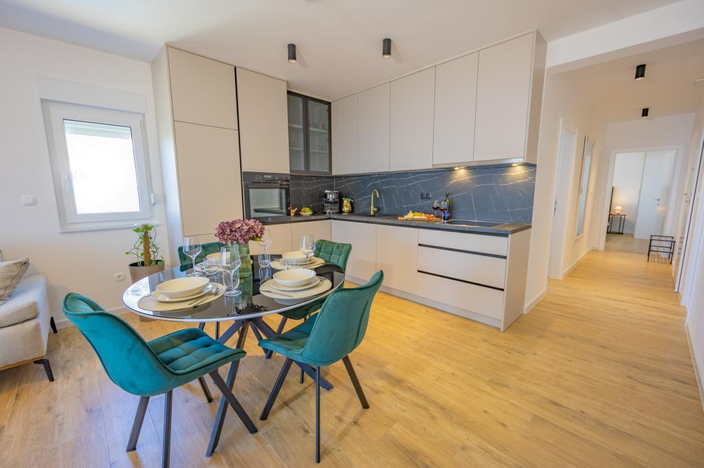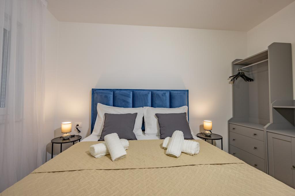 Jedes Apartment besticht durch modernes Design und ein frisch renoviertes Interieur. Im geräumigen Wohnzimmer, geschmackvoll mit Möbeln und modernen Details eingerichtet, werden Sie sich sofort wie zu Hause fühlen. Der offene Wohnbereich verbindet das Wohnzimmer nahtlos mit der voll ausgestatteten Küche, in der elegante Arbeitsplatten, hochwertige Geräte und ausreichend Platz zum Zubereiten Ihrer Lieblingsgerichte auf Sie warten. Vom Wohnbereich gelangen Sie auf einen schönen Balkon – der ideale Ort für den Morgenkaffee oder zum Entspannen am Abend bei einem Glas Wein und einem unvergesslichen Sonnenuntergang über der Adria. Jedes Apartment verfügt über zwei komfortable Schlafzimmer mit Doppelbetten, ausgestattet mit weicher Bettwäsche und viel Stauraum, ein modernes Badezimmer und ein separates WC. Die Apartments sind klimatisiert und komplett ausgestattet: TV/Sat, Internet, Waschmaschine, Geschirrspüler, Kaffeemaschine und alles, was Sie für einen angenehmen und unbeschwerten Aufenthalt benötigen.