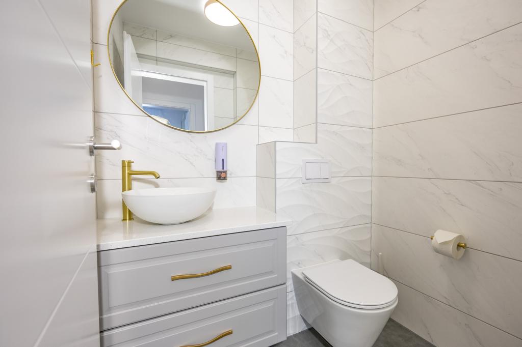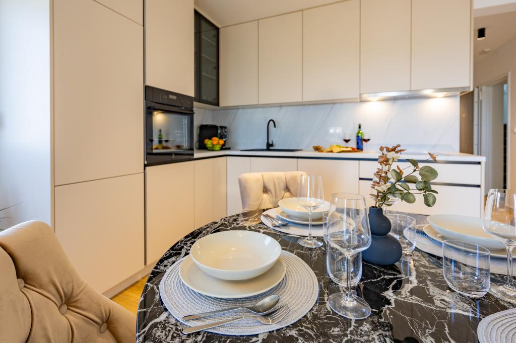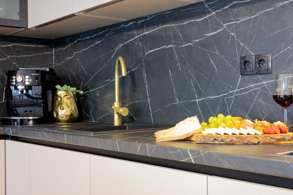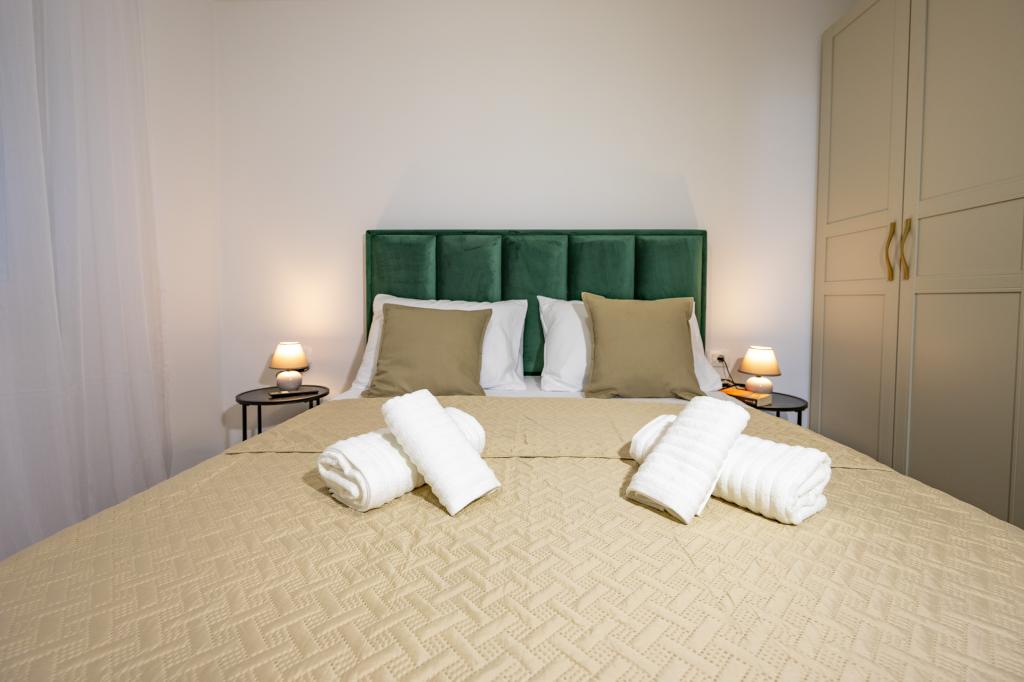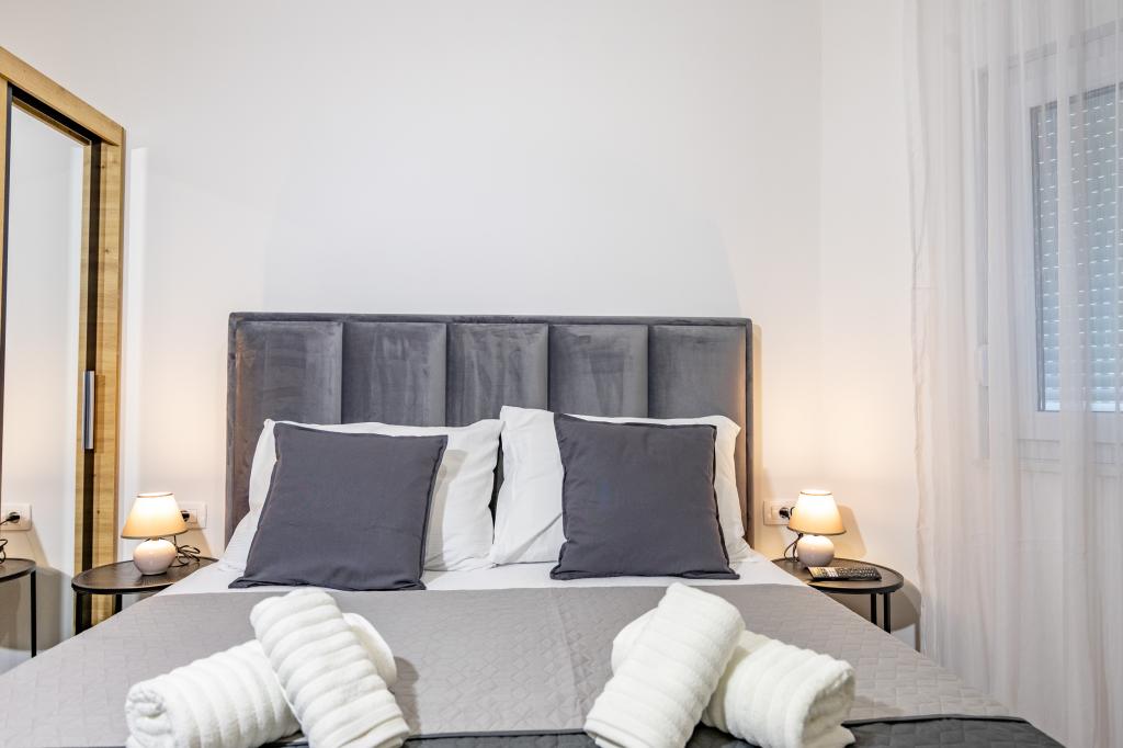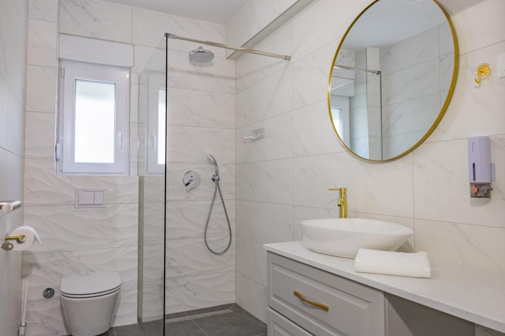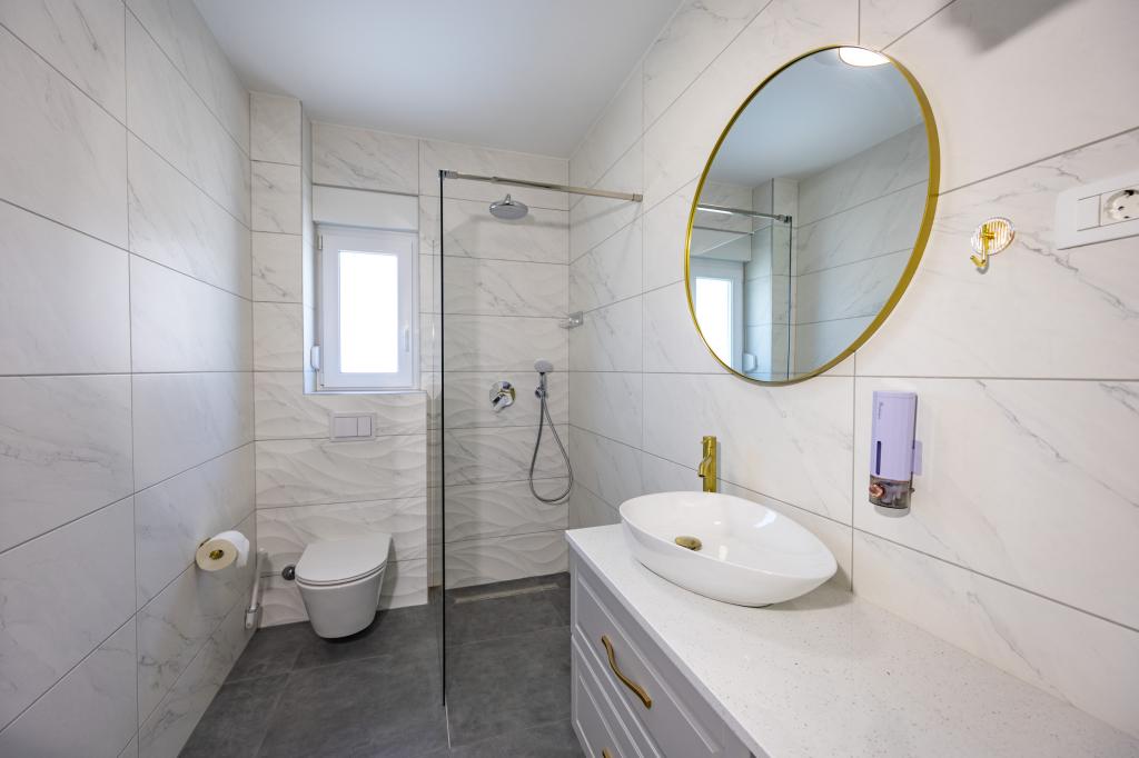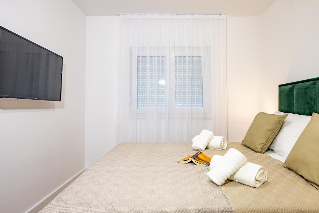 Jedes Apartment besticht durch modernes Design und ein frisch renoviertes Interieur. Im geräumigen Wohnzimmer, geschmackvoll mit Möbeln und modernen Details eingerichtet, werden Sie sich sofort wie zu Hause fühlen. Der offene Wohnbereich verbindet das Wohnzimmer nahtlos mit der voll ausgestatteten Küche, in der elegante Arbeitsplatten, hochwertige Geräte und ausreichend Platz zum Zubereiten Ihrer Lieblingsgerichte auf Sie warten. Vom Wohnbereich gelangen Sie auf einen schönen Balkon – der ideale Ort für den Morgenkaffee oder zum Entspannen am Abend bei einem Glas Wein und einem unvergesslichen Sonnenuntergang über der Adria. Jedes Apartment verfügt über zwei komfortable Schlafzimmer mit Doppelbetten, ausgestattet mit weicher Bettwäsche und viel Stauraum, ein modernes Badezimmer und ein separates WC. Die Apartments sind klimatisiert und komplett ausgestattet: TV/Sat, Internet, Waschmaschine, Geschirrspüler, Kaffeemaschine und alles, was Sie für einen angenehmen und unbeschwerten Aufenthalt benötigen.