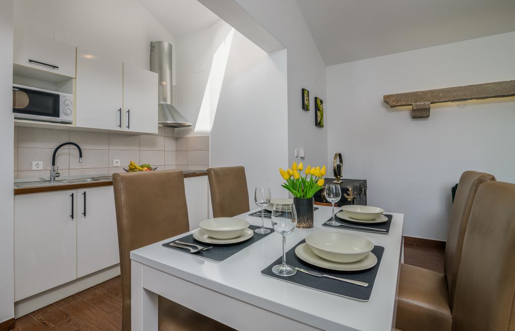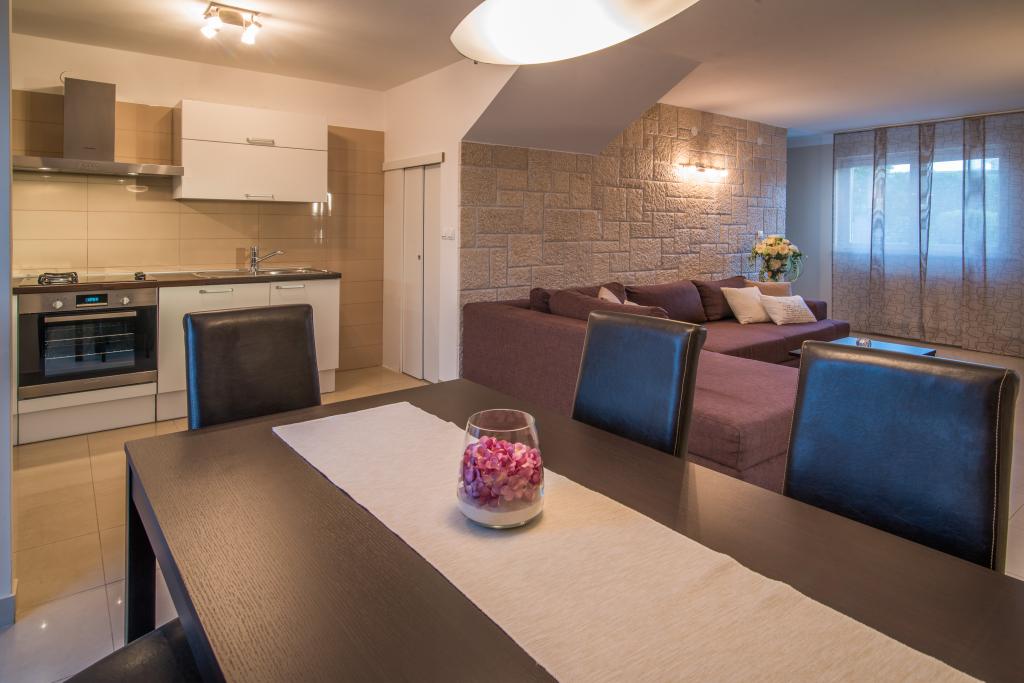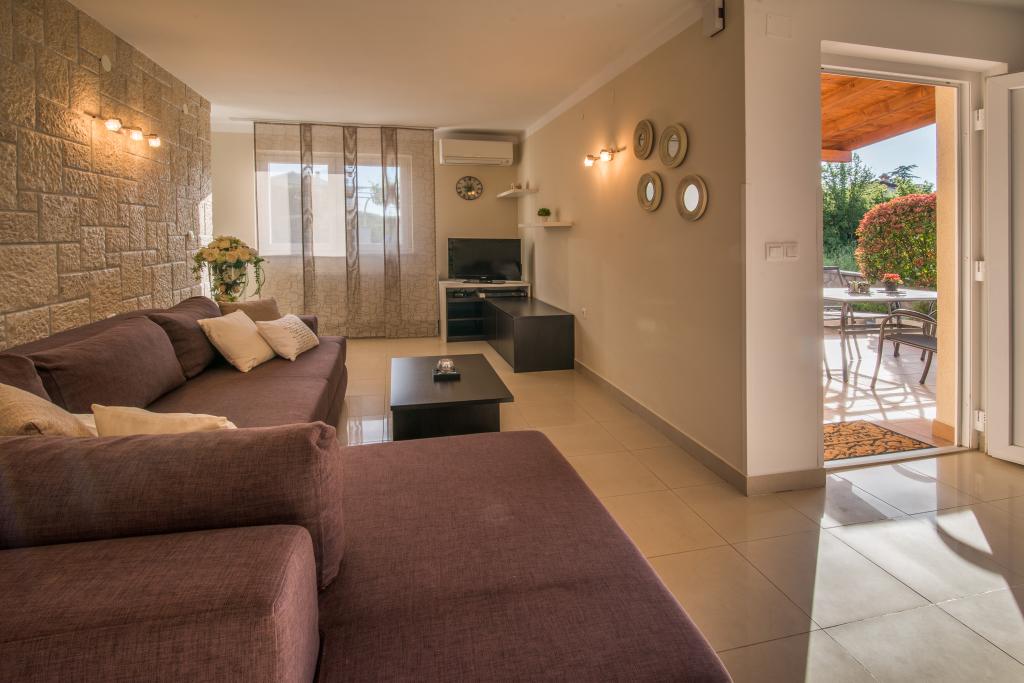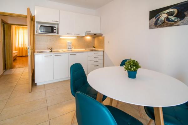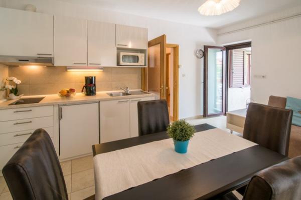Ueppige mediterrane Vegetation, berauschende Duft des Meeres, wohltuende Stille, Naehe des Strandes, der Restaurants und mancher Geschaefte beschreiben am besten die Umgebung unserer Ferienwohnungen. Die Entfernung von der wunderschoenen Bucht Rova betraegt etwa 250 m und bis zum Zentrum etwa 1500 m. Alles oben angefuehrte macht die Entscheidung, Ihren Familienurlaub bei uns zu verbringen, zu einer gut getroffenen Auswahl. Im Erdgeschoss unseres Familienhauses sind 2 Ferienwohnungen mit je einem Zimmer und bieten eine Unterkunftsmoeglichkeit fuer 4-5 Personen. Jede Ferienwohnung hat eine eigene Terrasse, darueber hinaus gibt es einen Garten, einen Hof und eigenen Parkplatz.