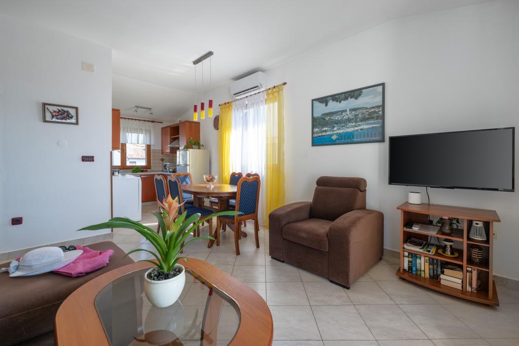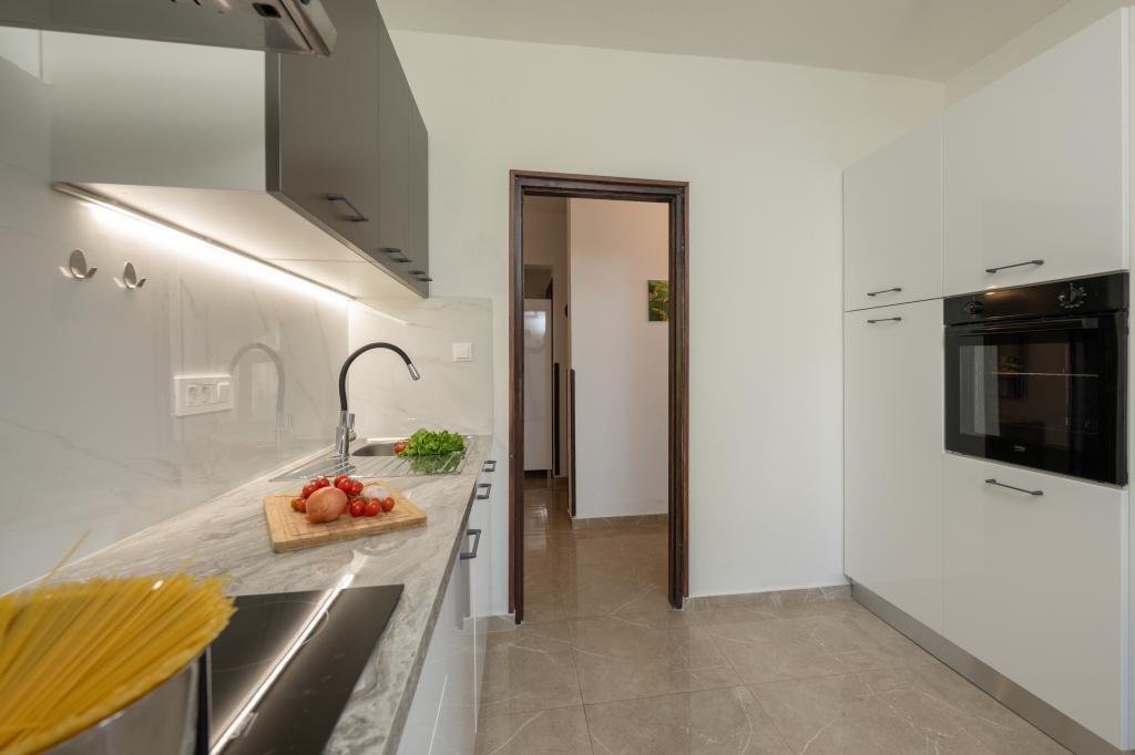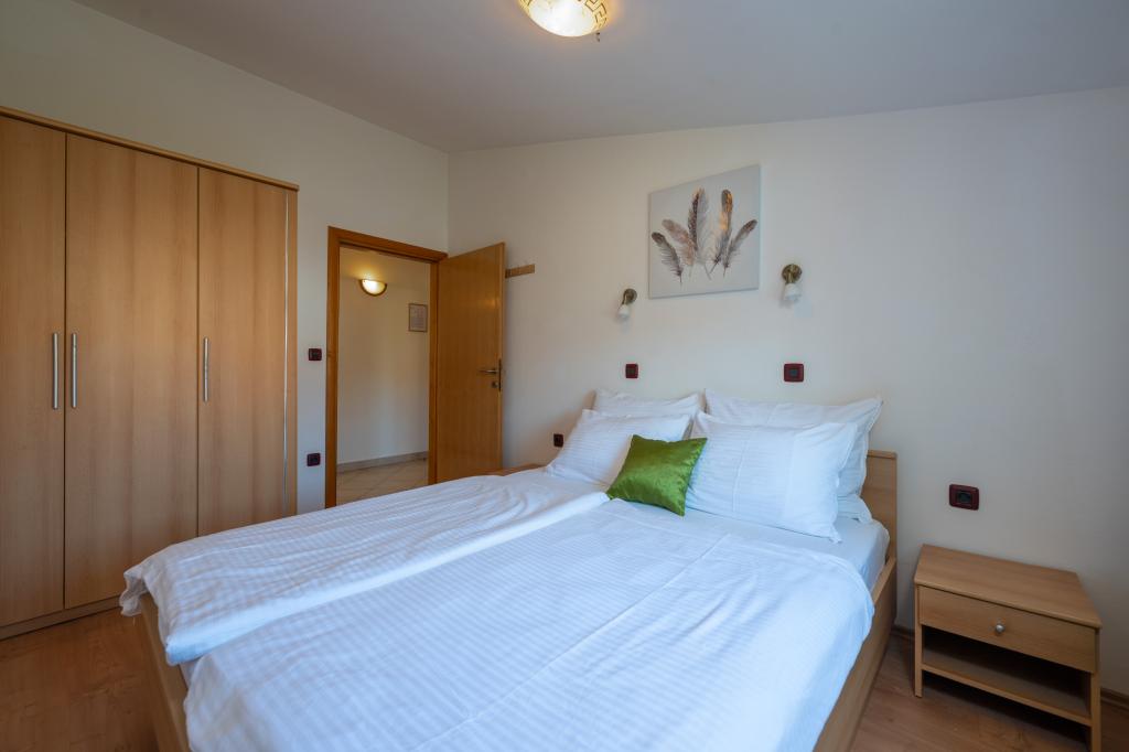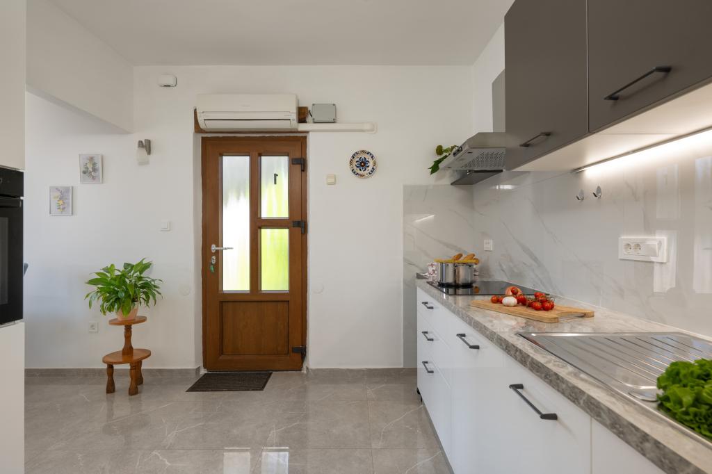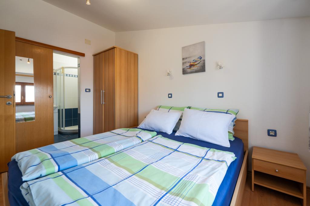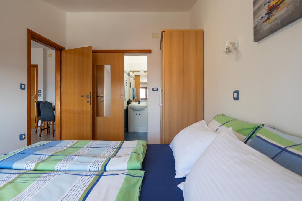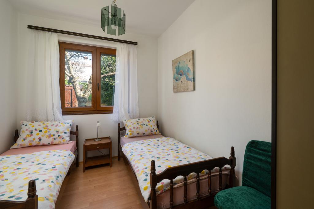 Das Haus liegt in einem ruhigen Teil von Medulin, 250–300 m vom Strand entfernt, mit einem großen Garten und privatem Parkplatz. Es stehen vier komplett und modern ausgestattete Apartments zur Miete bereit. Zwei Apartments befinden sich im Erdgeschoss: Apartment Nr. 1 mit zwei Schlafzimmern, Küche, Wohnzimmer, Bad und Terrasse; Apartment Nr. 2 mit einem Schlafzimmer, Küche, Bad und Gartenterrasse. Im zweiten Stock befindet sich Apartment Nr. 3 mit zwei Schlafzimmern, Küche, Wohnzimmer, Bad und Balkon; Apartment Nr. 4 mit einem Schlafzimmer, Küche, Wohnzimmer, Bad und Balkon. Alle Apartments verfügen über Klimaanlage, WLAN und Sat-TV. Bettwäsche, Handtücher, Kurtaxe und Registrierung sind im Preis inbegriffen. Jedes Apartment hat einen eigenen Parkplatz, einen Garten und einen tragbaren Grill. Waschmaschinenmiete: 5 Euro, Zustellbett: 10 Euro. Parkplatz und Hof sind videoüberwacht.