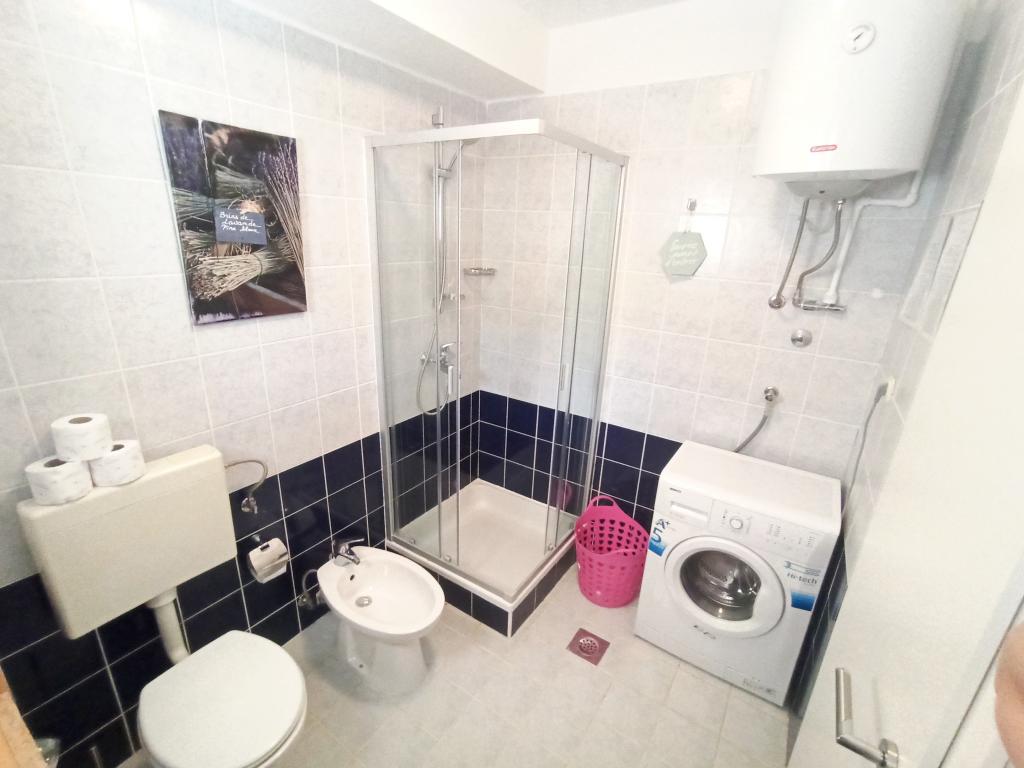 Die komplett und modern ausgestattete Wohnung befindet sich im Hochparterre eines kleinen Gebäudes. Die Wohnung besteht aus: Küche: ausgestattet mit allem, was Sie für einen angenehmen Aufenthalt benötigen: - Wohnzimmer mit Klimaanlage und LCD-TV. Außerdem gibt es im Wohnbereich ein Sofa, das bei Bedarf in ein bequemes Bett verwandelt werden kann. -Völlig neue Küche, komplett ausgestattet (einschließlich Herd, Geschirrspüler, Backofen, komplettem Geschirr, Mikrowelle). Es besteht aus 2 Schlafzimmern: Zimmer 1: besteht aus einem Doppelbett und einem Einzelbett. Zimmer 2: besteht aus 2 Einzelbetten. WC-Duschkabine, mit allen Sanitärelementen und Waschmaschine. Die Besonderheit der Wohnung liegt in einer großen Terrasse auf dem Südseite, die Sie den ganzen Tag über genießen können. Die Terrasse verfügt über einen Essbereich im Freien und einen Grill. Auf der Terrasse steht ein großer Olivenbaum, der den ganzen Tag über natürlichen Schatten spendet. Direkt vor der Wohnung befindet sich ein privater Parkplatz.