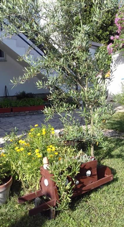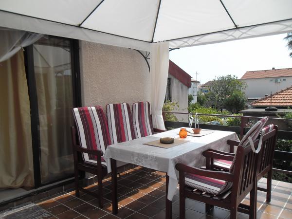 sehr hilfsbereite Besitzerin, begrüßte uns nach Hause Rakia und eigene Minze Limonade, saubere, gemütliche Unterkunft, Küche voll möbliert, schöne Terrasse, schöner Garten, der Strand ca. 30 m, Strandbeton, im Wasser kleine Steine konnten ohne Schuhe laufen Wasser, ca. 200 m Strand von diesen Steinen entfernt, das nächste Restaurant ca. 5 Minuten, in die Stadt am Strand ca. 15 Minuten zu Fuß