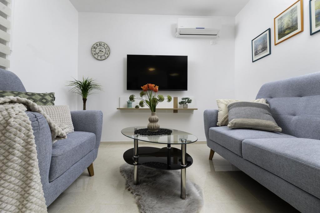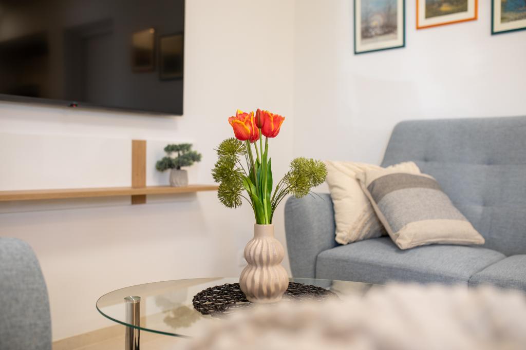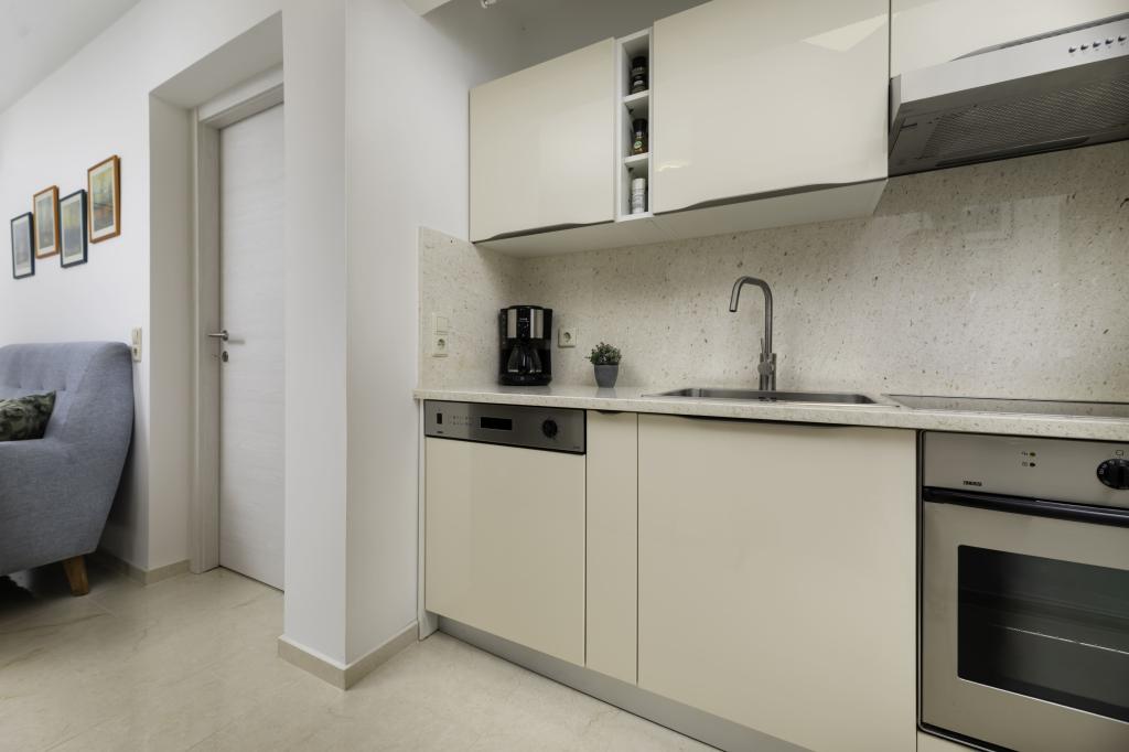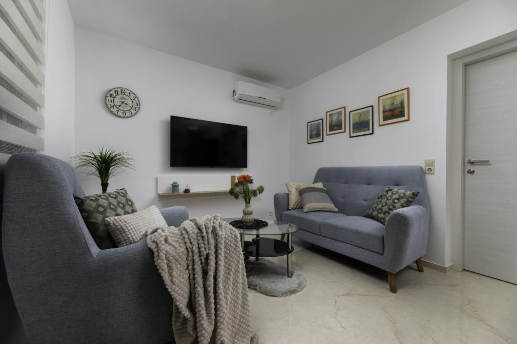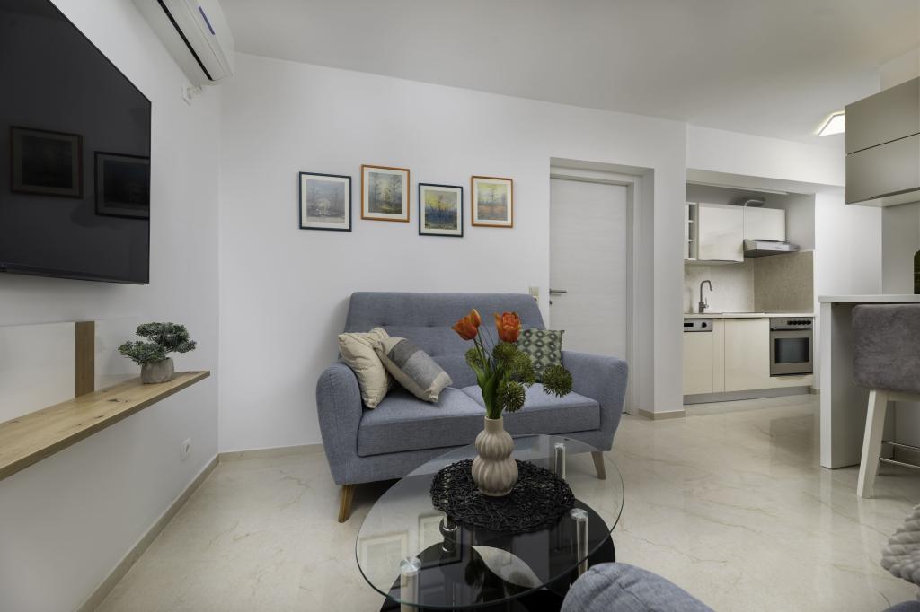 In ruhiger Lage in Njivice auf der Insel Krk gelegen, bietet dieses frisch renovierte Erdgeschoss-Apartment die ideale Kombination aus Komfort und entspannter mediterraner Atmosphäre. Es ist perfekt für Familien oder kleinere Gruppen, die einen ruhigen und ungestörten Urlaub am Meer verbringen möchten. Das Apartment verfügt über zwei geräumige Schlafzimmer, ein modernes Badezimmer und ein separates WC. Eines der Schlafzimmer hat ein kleines Zimmer mit einem Zustellbett. Eine voll ausgestattete Küche und ein gemütliches Wohnzimmer bieten alles für einen erholsamen Aufenthalt. Ein besonderes Highlight ist die überdachte Terrasse inmitten von Grün – ideal für den Morgenkaffee, ein gemeinsames Essen oder entspannte Abende. Zur Ausstattung gehören Klimaanlage, WLAN, ein privater Parkplatz, eine Außendusche und ein Grill. Der Strand ist nur 600 Meter entfernt, und in der Nähe finden Sie Restaurants, Geschäfte und alle Annehmlichkeiten für einen unbeschwerten Urlaub. Genießen Sie das kristallklare Meer, Spaziergänge entlang der Küste und die authentische Inselatmosphäre, die die perfekte Balance zwischen Erholung und Aktivität bietet.