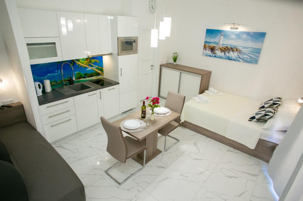 Modern ausgestattete Apartments mit voll ausgestatteter Küche, Wasserkocher, Toaster, Mikrowelle, Kaffeemaschine, Bügeleisen, Safe und Haartrockner.
