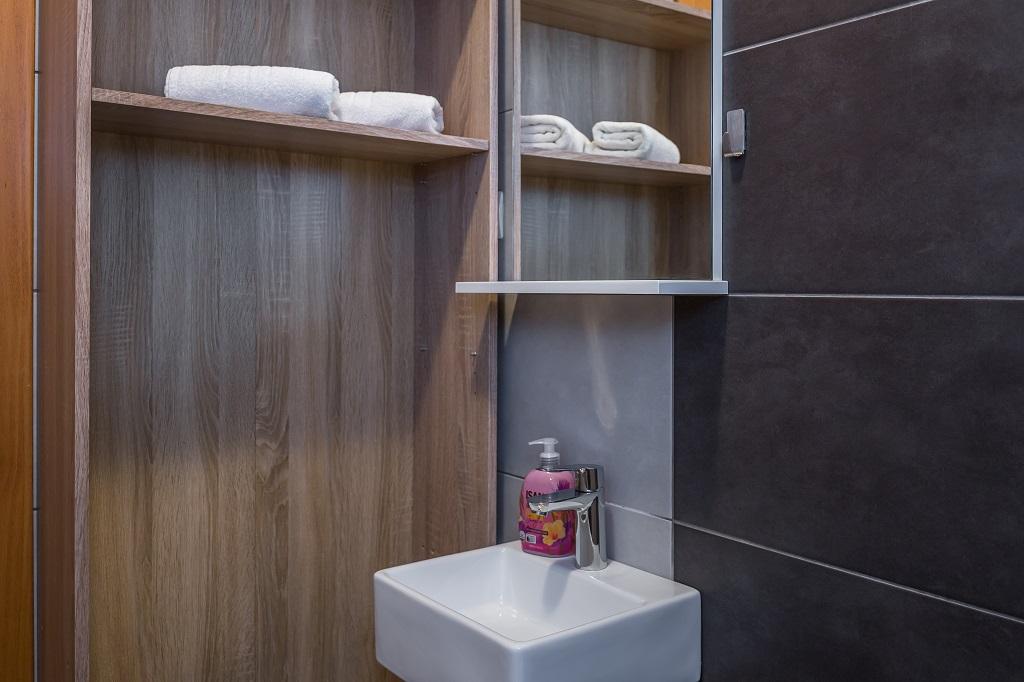 NEUE UND MODERNE WOHNUNG. Die Wohnung befindet sich in einem privaten Familienhaus mit Blick auf das Meer, die Inseln und die örtlichen Strände. In der Nähe des Zentrums von Omiš, nur 500 m entfernt. Alles ist ganz neu. Die Wohnung hat 95 m2. Es verfügt über 3 Schlafzimmer, ein Wohnzimmer, eine Küche mit Esszimmer, eine Toilette und ein zusätzliches Badezimmer, einen Balkon und einen Parkplatz in der Garage. Schlafzimmer: Ein Zimmer hat ein großes Bett (180 x 190) für 2 Personen. Das zweite Zimmer hat ein französisches Bett (160 x 190) für 2 Personen. Das dritte Zimmer hat ein Einzelbett (90 x 190) für 1 Person. Badezimmer mit Waschbecken und Dusche. WC mit Waschbecken und Waschmaschine. Die Küche ist komplett ausgestattet. Das Wohnzimmer ist geräumig. Großer Balkon mit Sitzgelegenheit.