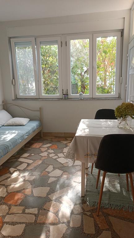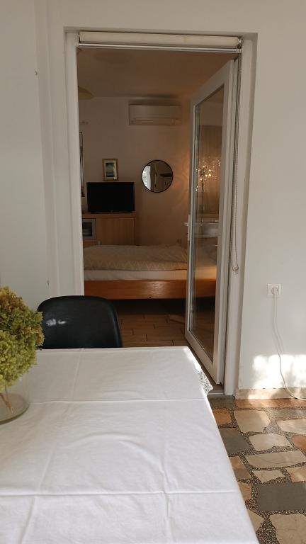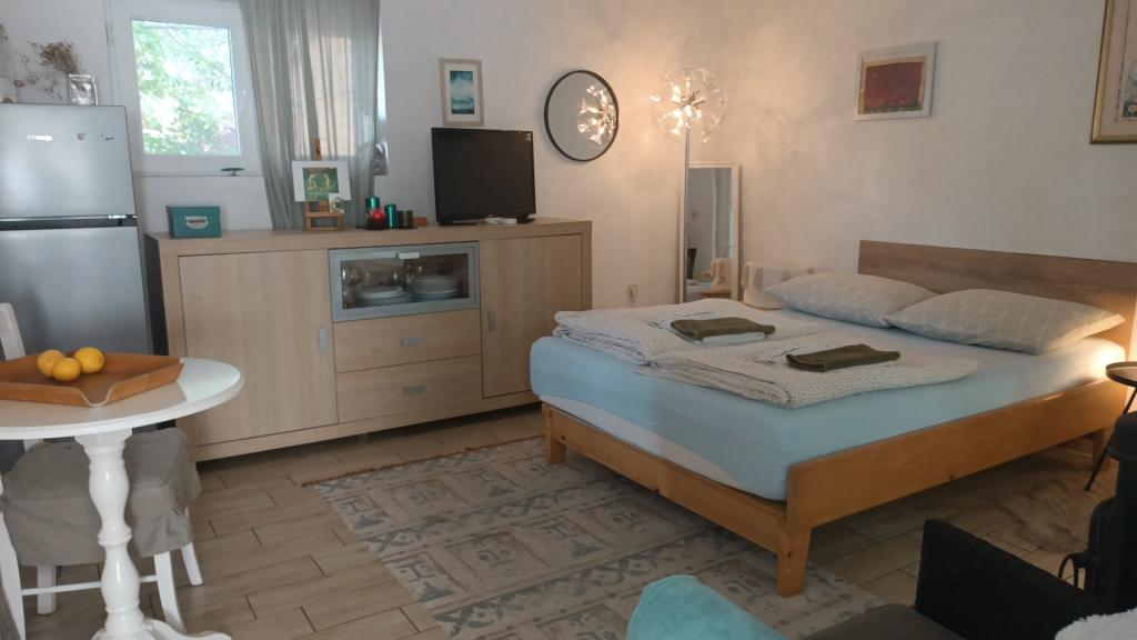 Das Log Inn Apartment befindet sich im ersten Stock eines Hauses mit nur zwei Wohnungen in einer ruhigen, familienfreundlichen Gasse. Der Garten des Hauses ist schattig mit Oliven-, Feigen- und Kiefernbäumen. Im Hof befindet sich ein Parkplatz. Das Stadtzentrum mit Geschäften, Bäckereien, Konditoreien, Cafés und Restaurants ist 10 Gehminuten entfernt, und der erste Kiesstrand ist nur 5-10 Gehminuten entfernt. Das Log Inn ist bei jedem Wetter angenehm zu verweilen, geräumig und verfügt über ein separates Zimmer mit Wohnzimmer, Spielzeug und Bilderbüchern. Es ist gut ausgestattet (Geschirr, Wasserkocher, Kaffeemaschine, Max-TV, WLAN, Klimaanlage) und im Wohnzimmer lässt es sich an Frühlingsabenden am Feuer im antiken Ofen entspannen. Die Terrasse mit Gartenmöbeln (Teakholz) lädt zum Spazieren ein und die Gäste frühstücken gerne, sonnen sich oder genießen den Abend mit Gerichten und gutem Wein aus der Region Šibenik. Das Studio ist kleiner und verfügt über eine kleinere Küchenzeile, ist aber dank des Gartens auch in der Sommerhitze angenehm. Beide Wohnungen verfügen über Klimaanlage und Heizung. Sie werden in der Nebensaison zu ermäßigten Preisen und monatsweise vermietet.