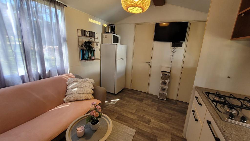 Das Zweizimmer-Mobilheim NALANI befindet sich im Camp Planik (24 m2) und verfügt über 5 Schlafplätze und ein Reisebett für Babys. Ein Zimmer verfügt über ein Doppelbett, das andere über zwei Einzelbetten und ein Etagenbett. Das Badezimmer verfügt über einen Haartrockner, Handtücher und Handseife. Die Küche verfügt über einen Herd, einen großen Kühlschrank, einen Wasserkocher, eine Kaffeemaschine und eine Mikrowelle. Im Wohnzimmer können Sie den Flachbildfernseher genießen und sich mit der Klimaanlage abkühlen. Am Eingang befindet sich eine große überdachte Terrasse (20 m2) mit Esstisch, Grill und Ruhebereich. Ein Parkplatz für 1 Auto ist kostenlos und steht hinter dem Mobilheim zur Verfügung. Haustiere sind gegen Aufpreis erlaubt!