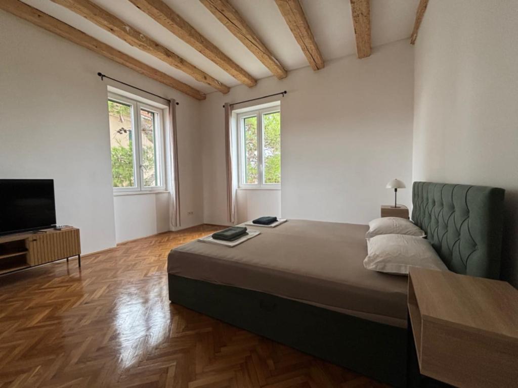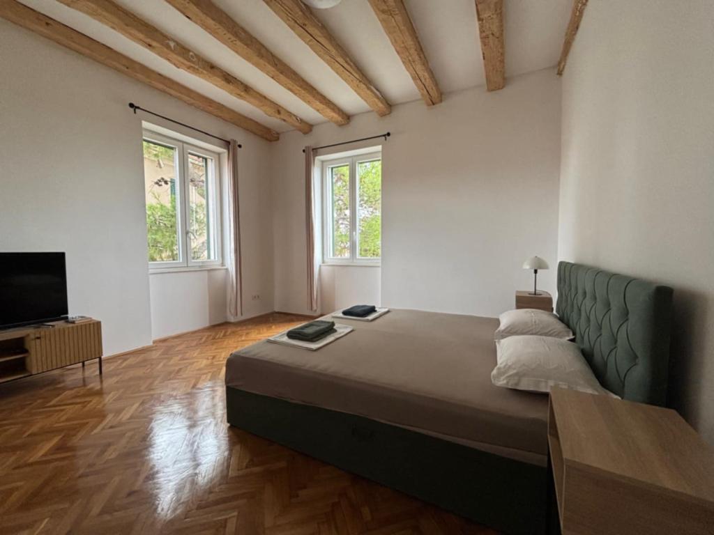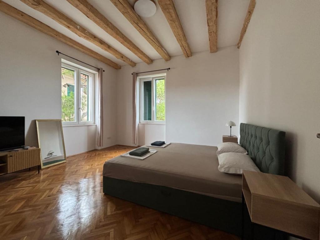 Willkommen im Apartment Spas! Entlang der St.-Spasa-Straße, die an der St.-Spasa-Kirche vorbeiführt, erreichen Sie das Stadtzentrum in wenigen Gehminuten. Vor der heißen Mittelmeersonne spenden Ihnen jahrhundertealte Zypressen, Pittosporum und Pinien, die die Straße und den Garten vor Ihrer Unterkunft schmücken, angenehmen Schatten. Im Garten können Sie grillen und auf Liegestühlen und Bänken entspannen. Das Apartment befindet sich im zweiten Stock und bietet einen herrlichen Blick auf die Bucht von Šibenik und die Festung St. Michael, die nur zehn Gehminuten entfernt liegt. Das Apartment Spas befindet sich in einer ruhigen Sackgasse, in der Nähe aller Annehmlichkeiten und doch fernab vom Trubel der Stadt.