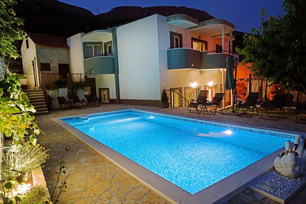 An den Hängen des Hügels Kozjak in Solin, nur 8 km von der Stadt Split entfernt, befindet sich dieses schöne Haus mit Swimmingpool. Lernen Sie das reiche kulturelle und historische Erbe der Stadt Split, Trogir und des antiken Salona kennen. DAS HAUS BESTEHT AUS ZWEI MODERN AUSGESTATTETEN WOHNEINHEITEN IM ERDGESCHOSS. Ideal für zwei Familien. Jede Wohneinheit besteht aus einem Schlafzimmer mit Doppelbett und eigenem Bad sowie einem weiteren Zimmer mit zwei Einzelbetten, die zu einem Doppelbett verbunden werden können. Klimatisiertes Wohnzimmer mit Schlafsofa und Sat-TV. Geräumige Toilette mit Whirlpool-Badewanne. Vor dem Haus können die Gäste einen privaten Pool mit einem magischen Blick auf die Adria und die Inseln und die Stadt Split genießen. Sie haben auch einen Außengrill und einen Pavillon mit Sitzgelegenheiten, wo Sie ein romantisches Abendessen genießen können. Gesicherter Parkplatz im Hof (nicht komplett eingezäunt).