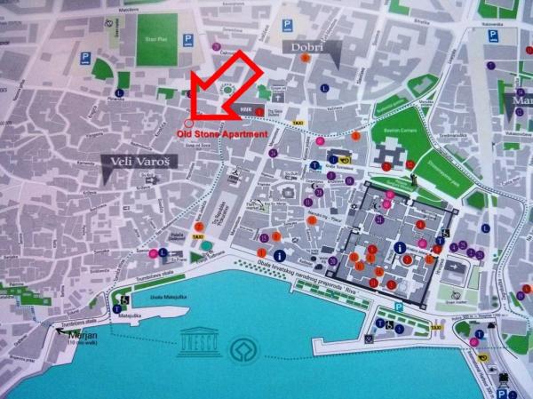 Old Stone House befindet sich im Herzen von Split in dem Teil der Stadt namens Vela Varos entfernt. Stadt ist voll von alten Häusern aus Stein geschmückt mit Blumen und kleinen Gassen (Straßen), die charakteristisch für Dalmatien. Die Wohnung befindet sich 650 m vom Diklecijanove Palast, nur 400 Meter von der Uferpromenade entfernt. Ein gemütlicher 15-minütigen Spaziergang Sie zum Marjan erhalten, an dessen Ufern man sich im Schatten der Pinien schwimmen und entspannen. Der Sandstrand Bačvice, ist etwa 1300 Meter vom Haus entfernt (15 min zu Fuß) entfernt. Ganz in der Nähe sind Peskarija (Markt mit frischem Fisch) und dem Markt (Markt mit frischem Obst und Gemüse). Die Wohnung befindet sich auf drei Etagen. Im Erdgeschoss ist ein Hof mit Grill, der nur für Gäste gedacht, die derzeit mit der Wohnung. Auf der ersten Etage gibt es eine Terrasse, zwei Schlafzimmer und ein Badezimmer. Auf der zweiten Etage befindet sich das Wohnzimmer mit Küche und Esszimmer. Die Küche verfügt über einen Kühlschrank, Backofen, Mikrowelle, Wasserkocher, Handtücher, Servietten ... im Bad sind Seife, Shampoo, Netzteil, Haare, Hygienebeutel ...