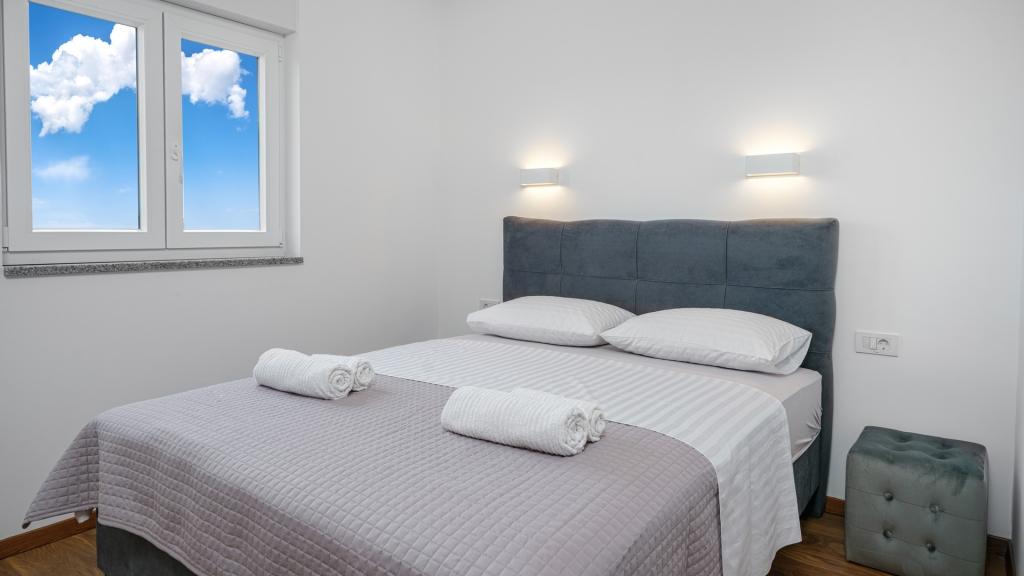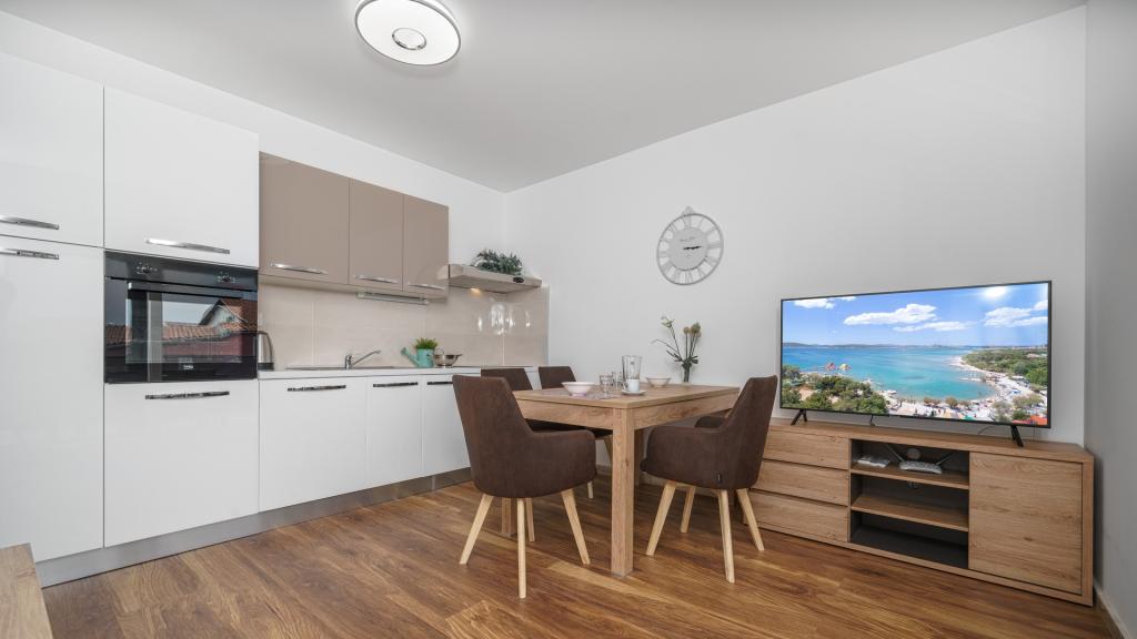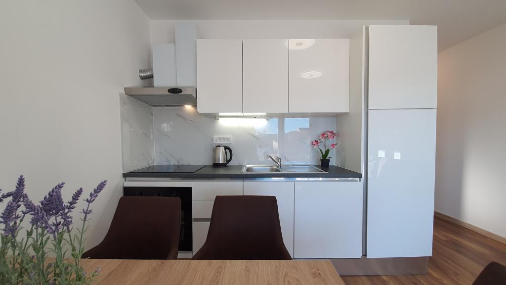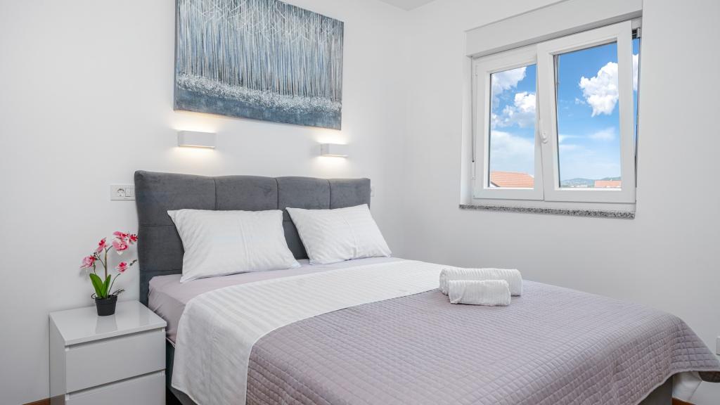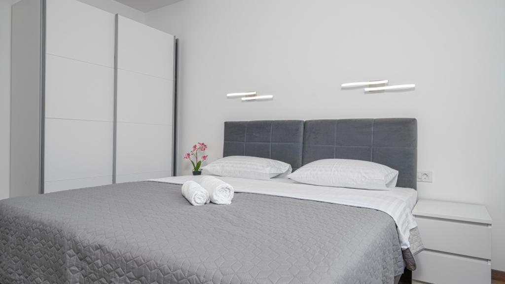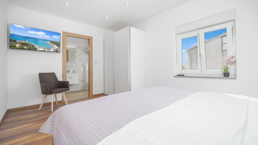 Apartvilla OKIT ist ein neu gebautes Haus mit Außenpool und eingezäuntem Garten. Das Haus befindet sich in Vodice, nur 150 m vom Strand entfernt. Es besteht aus 4 separaten Wohnungen, eine im Erdgeschoss Wohnung mit 4 Schlafzimmern, im 1. Stock eine Wohnung mit 3 Schlafzimmern und im 2. Stock 2 Wohnungen mit 2 Schlafzimmern. Wohnung OKIT 1 (130m2) befindet sich im Erdgeschoss, besteht aus 4 Schlafzimmern, 2 Bädern und Küche, Esszimmer und Wohnzimmer in einer Einheit mit Zugang zu einer überdachten Terrasse und einem Garten mit Swimmingpool mit Sitzecke und Grill. 3 Doppelzimmer, 1 Zweibettzimmer,. Die Küche ist mit allem notwendigen Zubehör zum Aufbewahren und Servieren von Speisen und Getränken, Geschirrspüler, Backofen, Kühl- und Gefrierschrank und Waschmaschine ausgestattet. Die Wohnung ist klimatisiert, hat Internetzugang und Parkplatz im Hof, ideale Unterkunft für 8 Personen.
