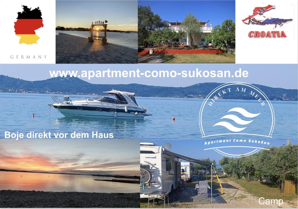 Willkommen im Apartment Como in Sukošan, Ihrer Ferienunterkunft 30 m vom Meer entfernt. Ideal für Bootsfahrer, Boje vor dem Haus. Für Schiffe bis ca. 8m (Stein auf der Boje 4-5 t.) Das Haus liegt in einem relativ ruhigen Teil am Ortsende, direkt am Meer und mehrere Strände (Kies) liegen direkt vor der Haustür sowie Restaurants, eine Strandbar und einen kleinen Supermarkt. Das Haus ist von einem grünen Garten mit Blumen, Oliven und Obstbäumen umgeben und versprüht einen dalmatinischen Charme. Die Wohnung bietet alles, was Sie für einen erholsamen Urlaub benötigen, egal ob mit Familie oder Freunden. Die Wohnung verfügt über (kostenloses Internet) WLAN, eine überdachte Außenterrasse, SAT-TV, eine voll ausgestattete Küche und ein Badezimmer mit Dusche. Und 2 Schlafzimmer mit jeweils einem Doppelbett. Die Wohnung hat keinen Meerblick. Der Strand des Hauses liegt jedoch nur 30 m von der Wohnung entfernt und ist nur durch eine Straße getrennt.