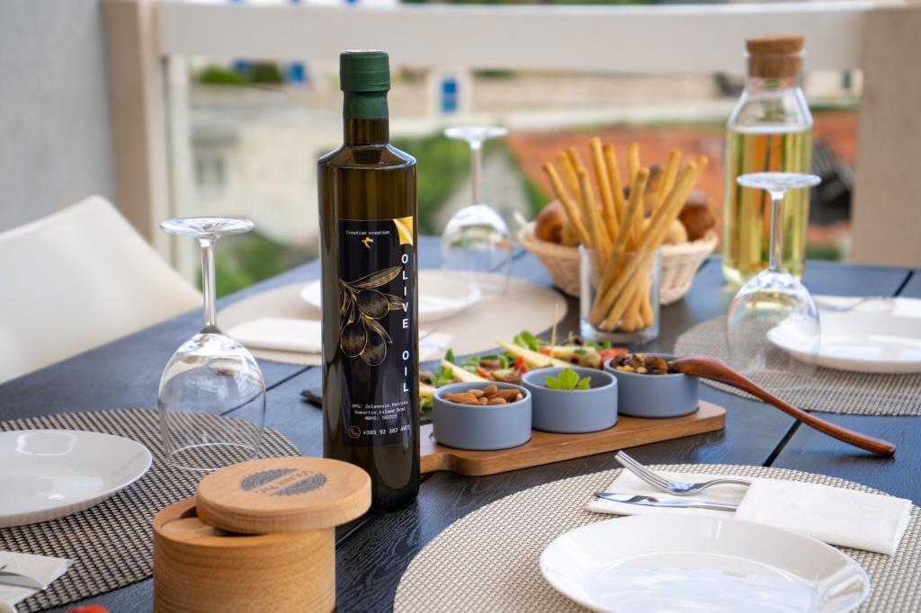 Wir bieten Ihnen eine geräumige private Terrasse, die sich perfekt zum Entspannen oder für Mahlzeiten im Freien eignet, einen Grillplatz mit der notwendigen Ausstattung, eine moderne, voll ausgestattete Küche (Geschirrspüler, Kühlschrank mit Gefrierfach, Backofen, Mikrowelle, Wasserkocher, Toaster, Mixer, Dolce Gusto Kaffeemaschine, Gewürze usw.), ein komfortables Wohnzimmer (kostenloses WLAN, Sat-TV, Netflix, Klimaanlage), zwei Schlafzimmer mit komfortablen Doppelbetten (Bettwäsche und Handtücher inklusive), ein Badezimmer (Haartrockner, Waschmittel, Wäscheständer, Duschgel usw.), kostenlose, sichere Parkplätze exklusiv für unsere Gäste sowie eine Verkostung lokaler Produkte von unserem Familienbauernhof, darunter natives Olivenöl extra und eine Auswahl traditioneller Inselspezialitäten – ein wahrer Genuss unserer Kultur!