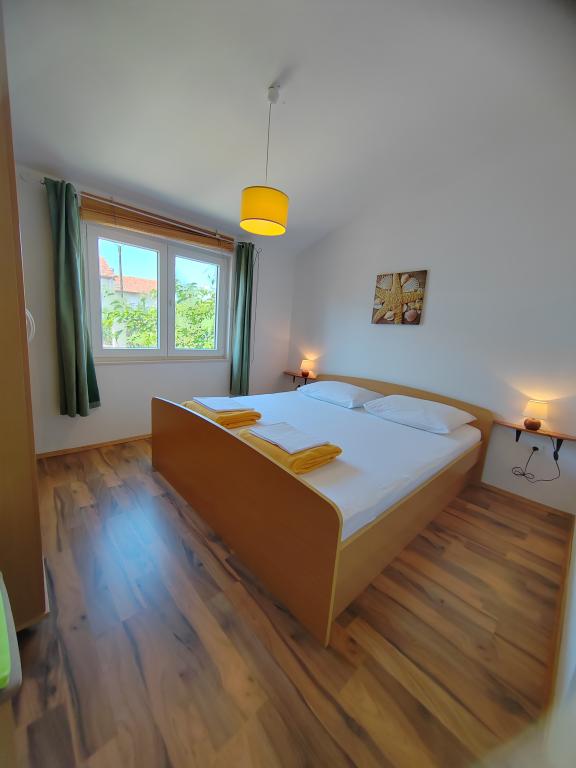 Nahe dem Zentrum und dem Strand (150 m). Zwei Ferienwohnungen befinden sich in einem Einfamilienhaus (im ersten Stock), 150 m vom Strand und dem Stadtzentrum entfernt. Jede Ferienwohnung verfügt über zwei Schlafzimmer, ein Badezimmer, eine Waschmaschine, Klimaanlage, eine Küche mit Essbereich und einem Schlafsofa sowie eine große Terrasse (20 m²). Alles ist im Preis inbegriffen. Im Garten gibt es einen Grill. Parkplätze befinden sich im Schatten vor dem Haus. Die Wohnung ist 70 m² groß.