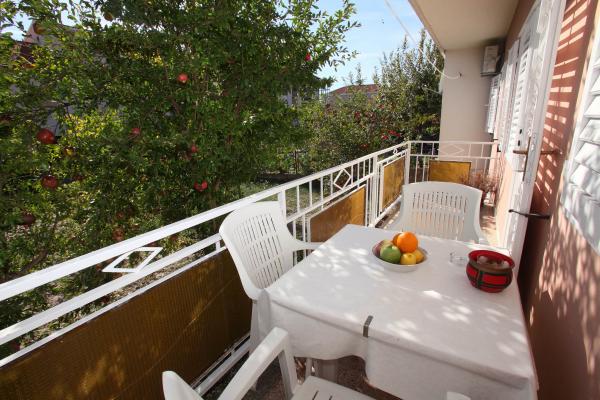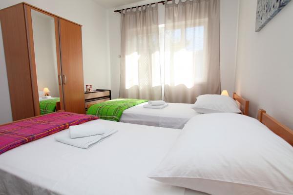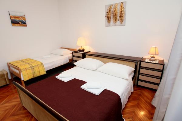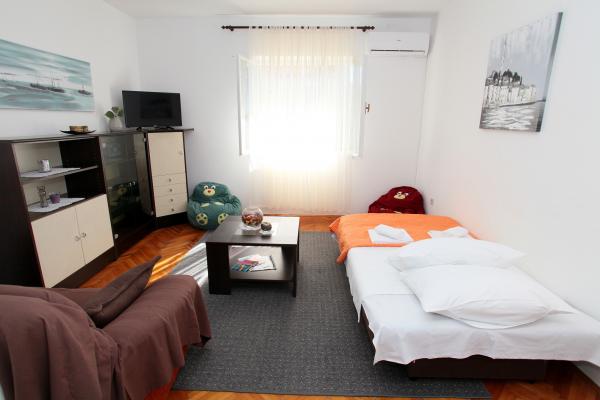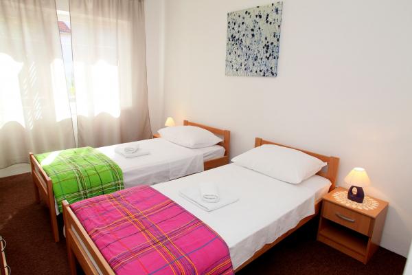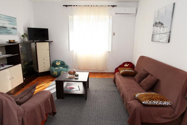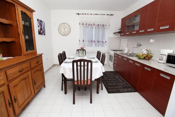 Die Wohnung ist 80 m2, komfortabel und von viel Grün umgeben und liegt in einem Familienhaus in der Nähe der Altstadt (ca. 10 Minuten zu Fuß). Die Wohnung ist komplett ausgestattet und besteht aus zwei Schlafzimmern (ein Dreibettzimmer und ein Doppelzimmer), Küche, Wohnzimmer, Bad und eine kleine Toilette. Im Wohnzimmer gibt es ein zusätzliches Bett für zwei Personen (Klick-Klack). Apartment verfügt über einen Balkon mit Tisch und Stühlen und eine Terrasse vor der Wohnung mit einem Tisch für einen angenehmen Aufenthalt im Schatten. Hinter dem Gebäude befindet sich ein kleiner Grill und einen kostenlosen Parkplatz für zwei Autos. Die Wohnung ist klimatisiert. Neuer öffentlicher Kiesstrand ist ca. 500 m entfernt. Der berühmteste Trogir Sandstrand ist zwei Busstationen und 1 km von der Wohnung entfernt. Mit Trogir Waterfront, alle 20 Minuten, zu erschwinglichen Preisen, ein Taxi-Boot zu den bekanntesten Stränden in Trogir Gebiet fahren.