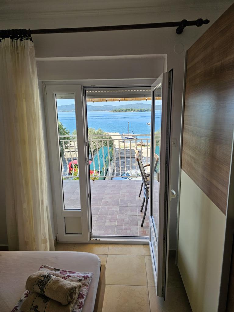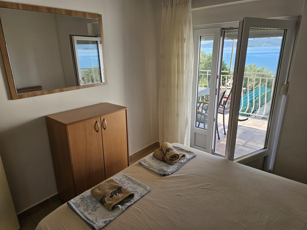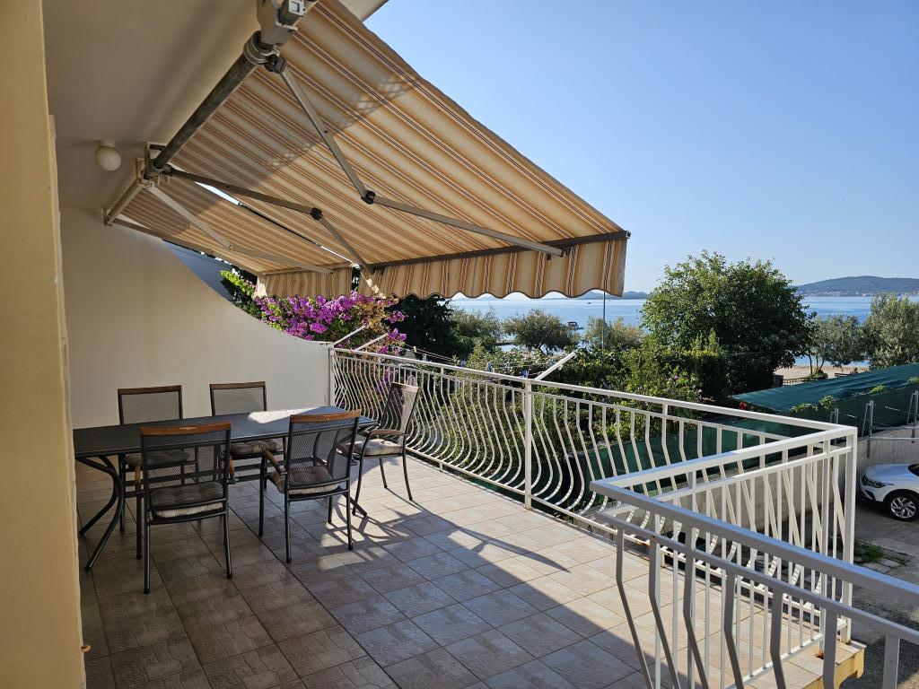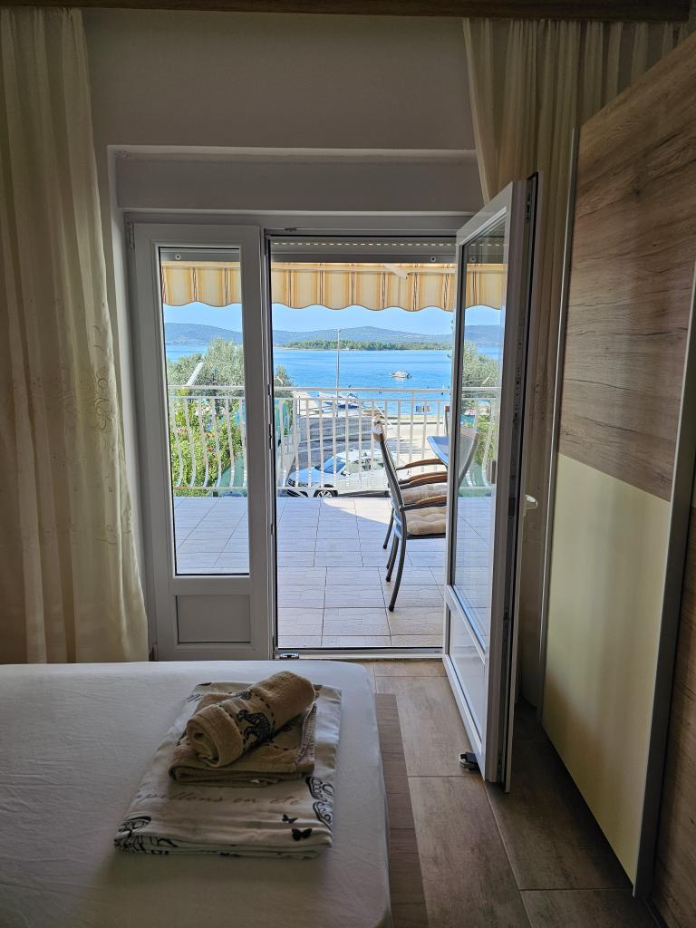 Perfekter Meerblick von der Terrasse. Netter Gastgeber. Parkplatz im Hof mit Überdachung für alle Gäste. Der Hof ist groß genug für Kinder zum Spielen und für geselliges Beisammensein. Es gibt einen überdachten gemauerten Grill mit Tisch und Bänken. Wer nach dem Schwimmen im Meer duschen möchte, kann im Hof mit Warmwasser duschen. Die Wohnung ist gepflegt und mit allem ausgestattet, was man braucht. Wir kommen nächstes Jahr wieder.