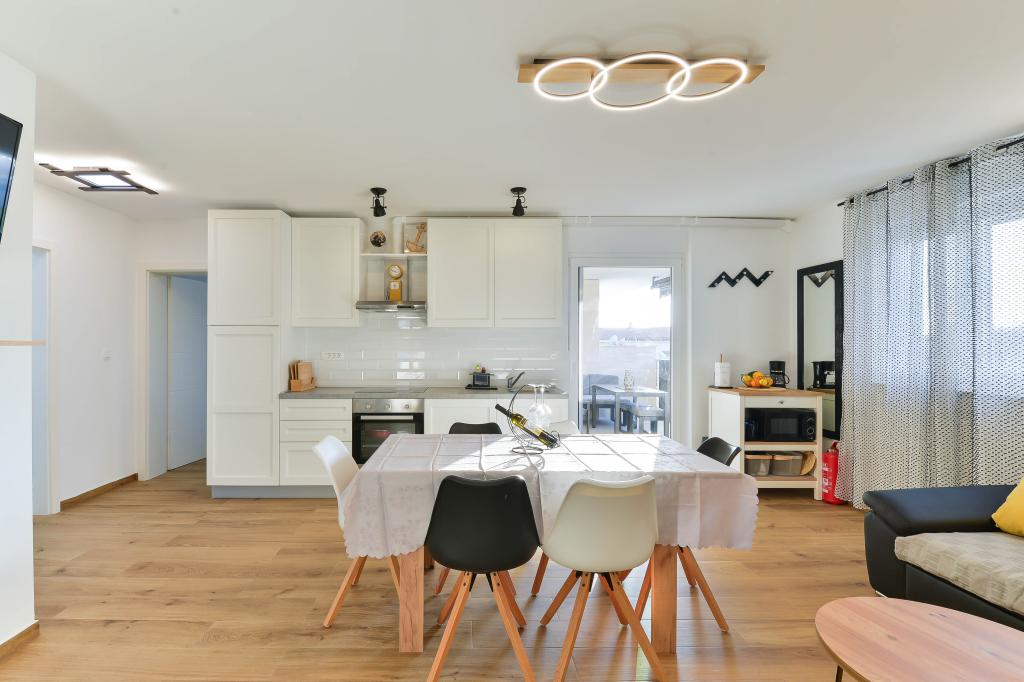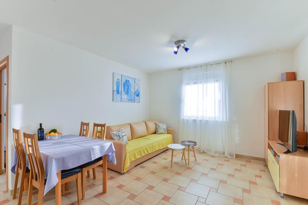 Voll ausgestattete Apartments, jedes Zimmer verfügt über eine eigene Klimaanlage und einen Fernseher und liegt 40 Meter vom Meer entfernt. Eine Bar, Restaurants und ein Supermarkt sind fußläufig erreichbar. Der Strand ist aus Kies und Beton, ein Sandstrand ist zehn Gehminuten entfernt. Das Haus verfügt über einen eigenen Parkplatz, Grill und Kinderschaukel im Garten. Den Gästen stehen Liegestühle, Sonnenschirme und Fahrräder zur Verfügung.