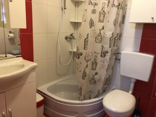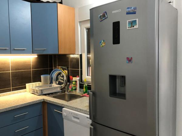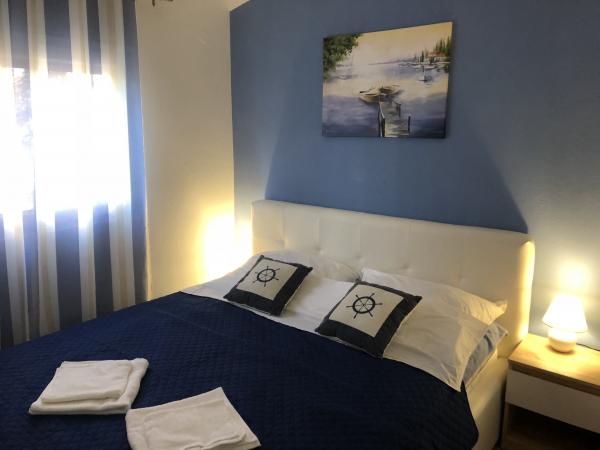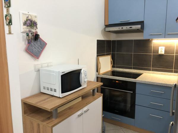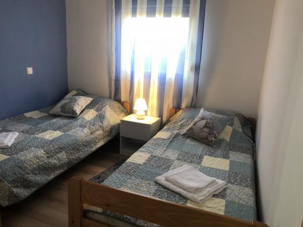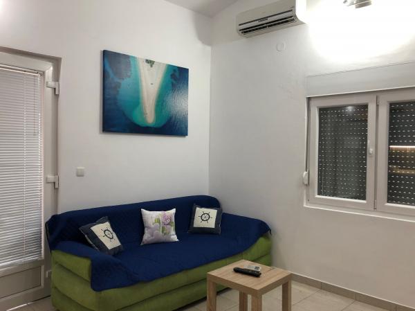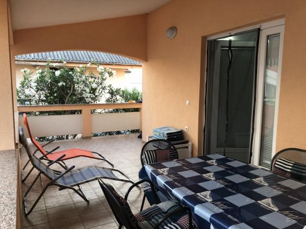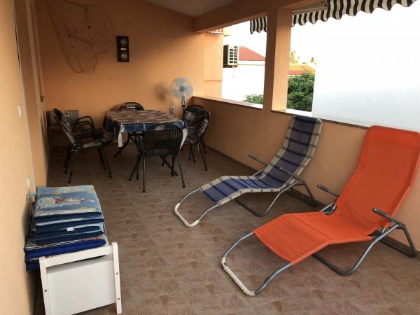 Modern ausgestattete Wohnung 200 m vom Strand entfernt und im ersten Teil der Insel gelegen. Die Wohnung (60 m2) befindet sich im ersten Stock und besteht aus zwei Schlafzimmern (ein Doppelbett und zwei getrennte Betten). Geräumiges Wohnzimmer mit Küche, Bad, Flatscreen-TV und WiFi-Internet. Die Küche verfügt über einen Geschirrspüler, eine Mikrowelle, einen großen Kühlschrank, einen Wasserkocher, einen Backofen und ein Kochfeld. Die großzügige Terrasse (15 m2) hat eine Markise und ist überdacht; Auf der Terrasse gibt es Liegestühle und einen großen Tisch für 6 Personen. Innerhalb der Wohnung besteht die Möglichkeit, einen gemeinsamen Grill und eine Waschmaschine zu nutzen. Das Wasser in der Wohnung ist trinkbar (aus der städtischen Wasserversorgung). Das Parken ist innerhalb des Gebäudes vorgesehen. Das Rauchen ist nur auf der Terrasse erlaubt.