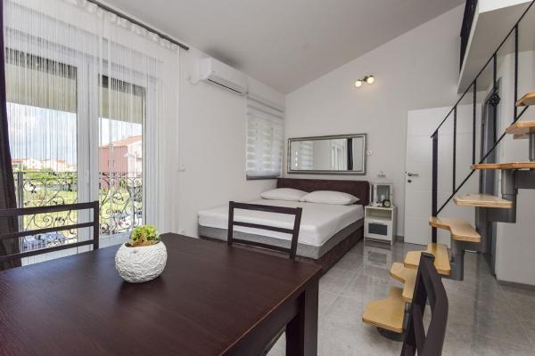 Schöne klimatisierte Apartments, neu nach modernen Standards ausgestattet, treffen und najzahtjenije, Hygiene gleichen einwandfrei. Die Wohnungen befinden sich in einer ruhigen Straße gelegen, mit einer großen Terrasse und einem schönen Pool. In der Nähe des Strandes in einem Kiefernwald, mit viel für Kinder und Erwachsene, sowie Hotels und Geschäften zu tun. Das Stadtzentrum und eine der schönsten Yachthafen an der Adria ist ein einfacher Spaziergang am Strand entlang, 5 Minuten.