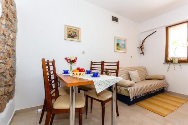Die Wohnungen befinden sich in Risika, einem ruhigen Ort neben Vrbnik auf der Insel Krk. Unterhalb gibt es einen schönen Sandstrand Sv. Marak ideal für Familien mit Kindern, mit Catering-Einrichtungen bereichert, liegt nur 1, 5 km entfernt. Ebenfalls in der Nähe sind kleine Kieselbuchten, auch mit dem Auto oder zu Fuß erreichbar. Apartments Anica befinden sich im Erdgeschoss. Jede Wohnung verfügt über eine eigene Terrasse mit Garten und viel Grün, Parkplätze im Hof. Jede Wohnung verfügt über ein Doppelzimmer, Wohnzimmer mit Essbereich, Schlafsofa (geeignet für einen Erwachsenen oder zwei Kinder), Küche und Bad.