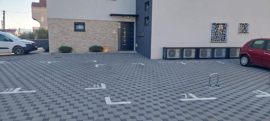 Zur Wohnung gehören zwei kostenlose Parkplätze (Nummer 7 und Nummer 8), die sich direkt vor dem Haupteingang befinden.