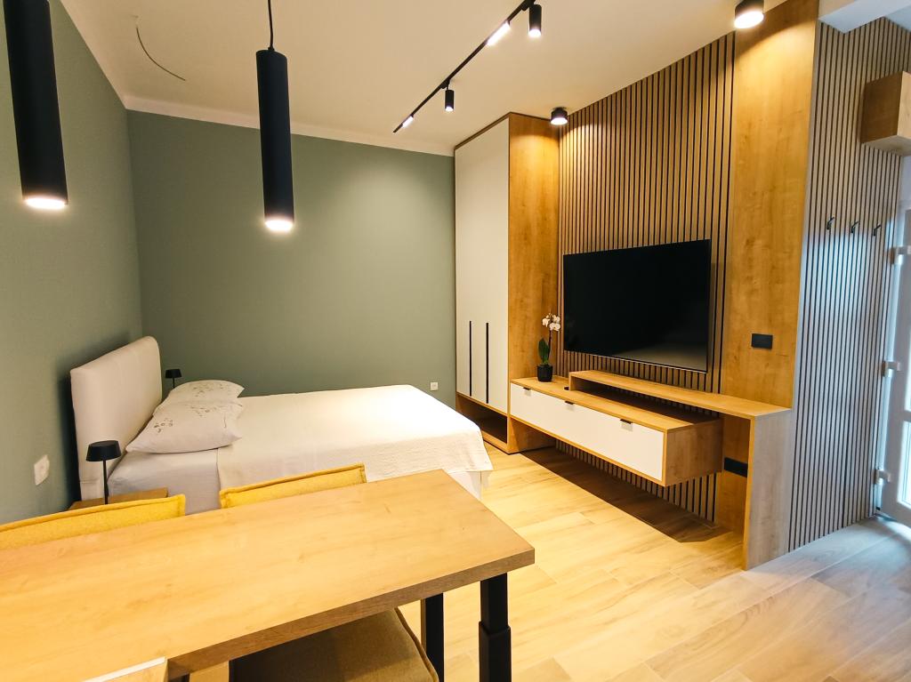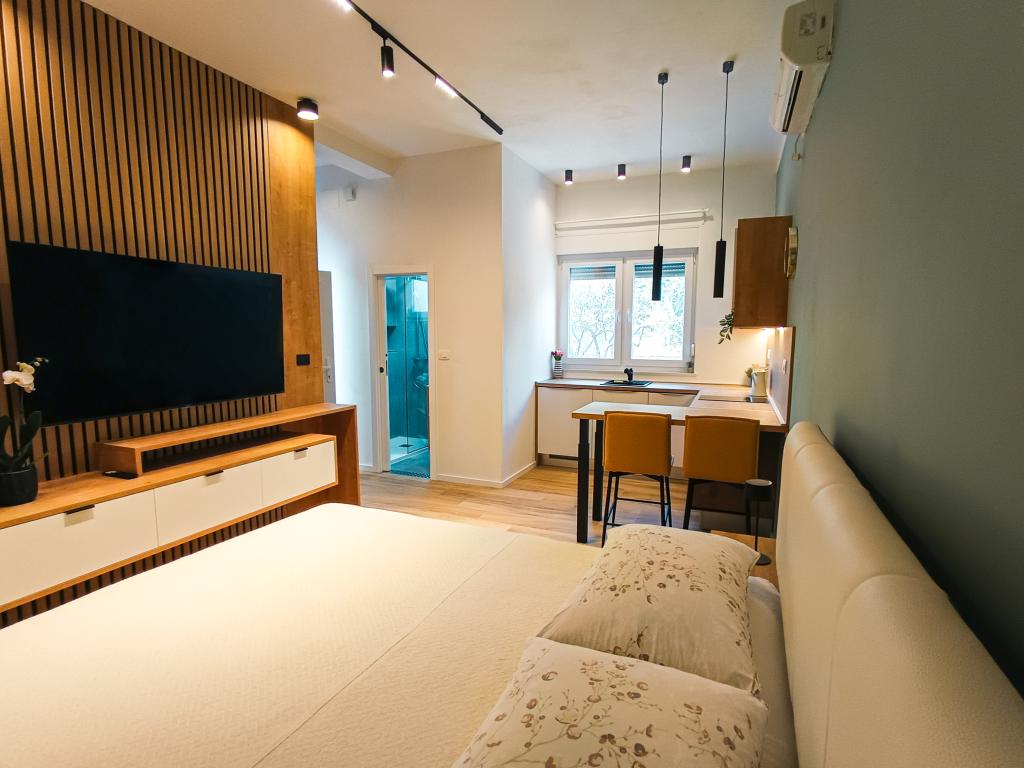 Vollständig und modern ausgestattetes Studio-Apartment in ruhiger, familienfreundlicher Lage. Ideal für Paare oder Familien mit einem Kind. Das klimatisierte Studio-Apartment bietet alle Annehmlichkeiten für einen unbeschwerten Urlaub in Zadar. Besonders hervorzuheben sind der große Fernseher, der Geschirrspüler, die Waschmaschine und der Einbaukühlschrank mit Gefrierfach. Alle notwendigen Kochutensilien und Grundgewürze sind vorhanden. Auf Wunsch stellen wir Ihnen gerne ein Kinderbett, einen Hochstuhl oder ein Zustellbett zur Verfügung. Zum Studio-Apartment gehört ein privater Parkplatz. Das Stadtzentrum erreichen Sie bequem zu Fuß in etwa 20 Minuten. Ganz in der Nähe befindet sich das Sport- und Freizeitzentrum Višnjik mit einem großen Kinderspielplatz – perfekt für alle, die gerne draußen aktiv sind.
