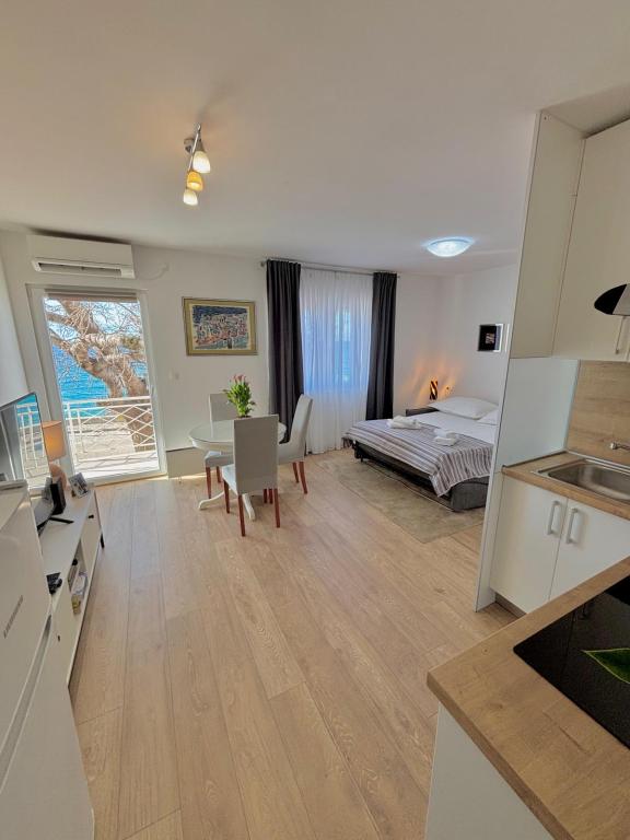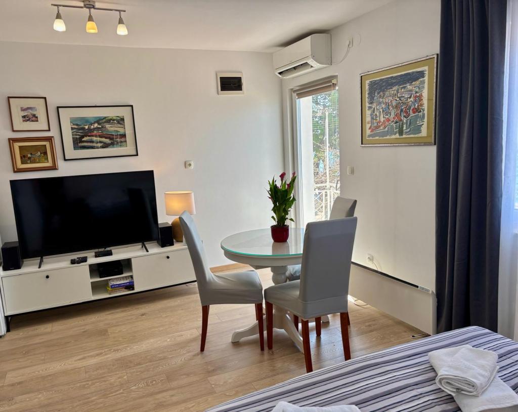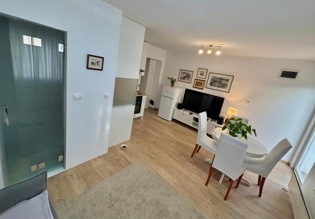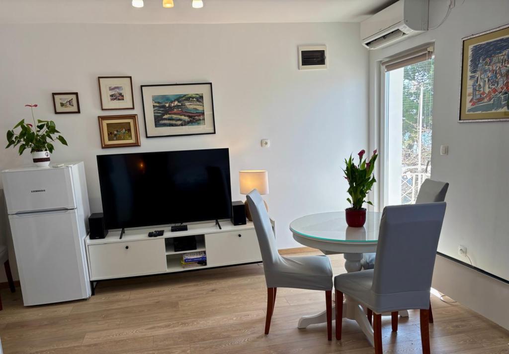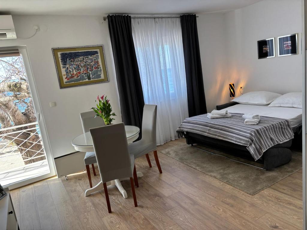 Das Studio-Apartment im ersten Stock eines Einfamilienhauses ist modern und komplett ausgestattet und liegt nur 30 m vom Meer und einem wunderschönen, flach abfallenden Kieselstrand entfernt. Vor dem Haus befindet sich ein Parkplatz, und im Garten gibt es einen Pavillon mit Grill und Tischen zum Verweilen im Schatten. In der Nähe finden Sie Geschäfte, Restaurants und eine Konditorei. Am Ortseingang liegt das Einkaufszentrum Plodine.