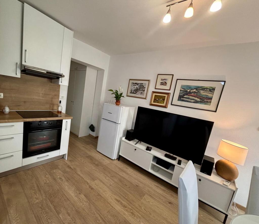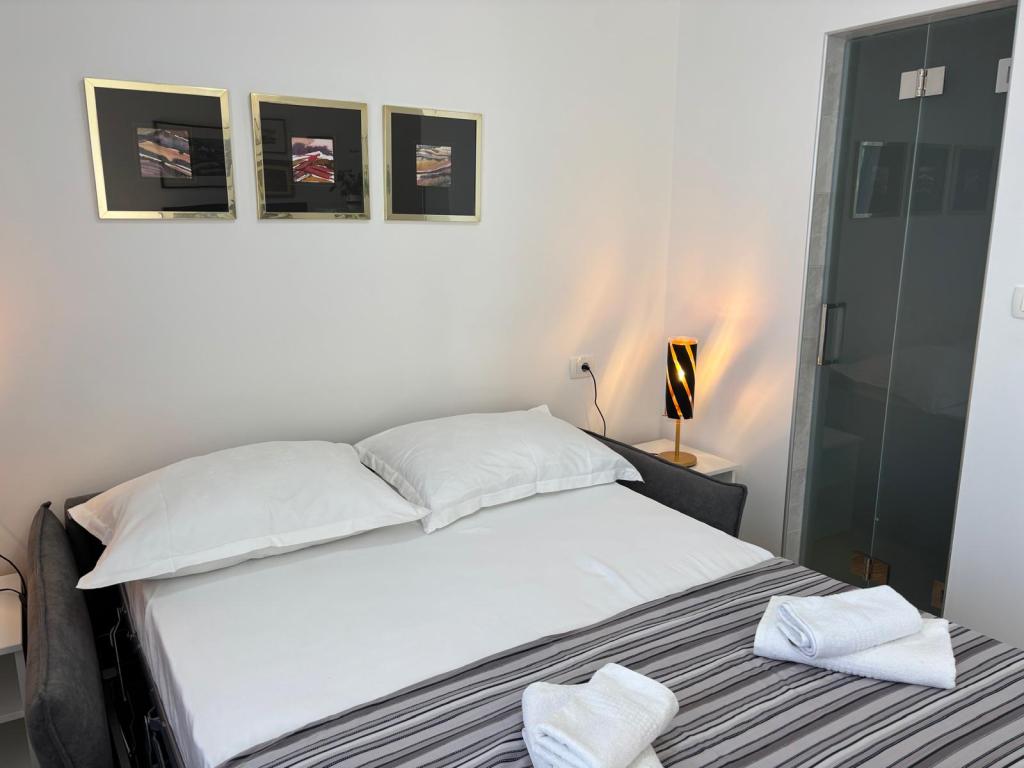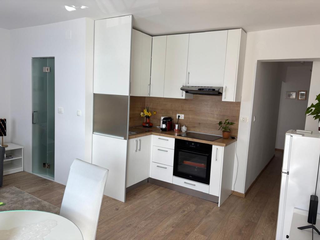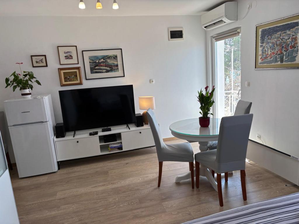 Das Studio-Apartment im ersten Stock eines Einfamilienhauses ist modern und komplett ausgestattet und liegt nur 30 m vom Meer und einem wunderschönen, flach abfallenden Kieselstrand entfernt. Vor dem Haus befindet sich ein Parkplatz, und im Garten gibt es einen Pavillon mit Grill und Tischen zum Verweilen im Schatten. In der Nähe finden Sie Geschäfte, Restaurants und eine Konditorei. Am Ortseingang liegt das Einkaufszentrum Plodine.